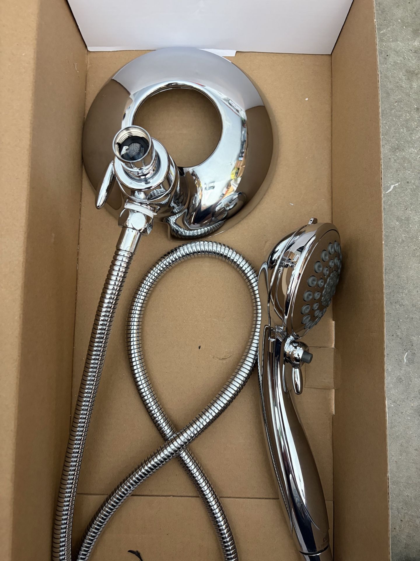Very new, used 10 times. Has 3 spray options, click button to stop flow. Detachable handle Delta Saylor intuition monitor 17 is the style