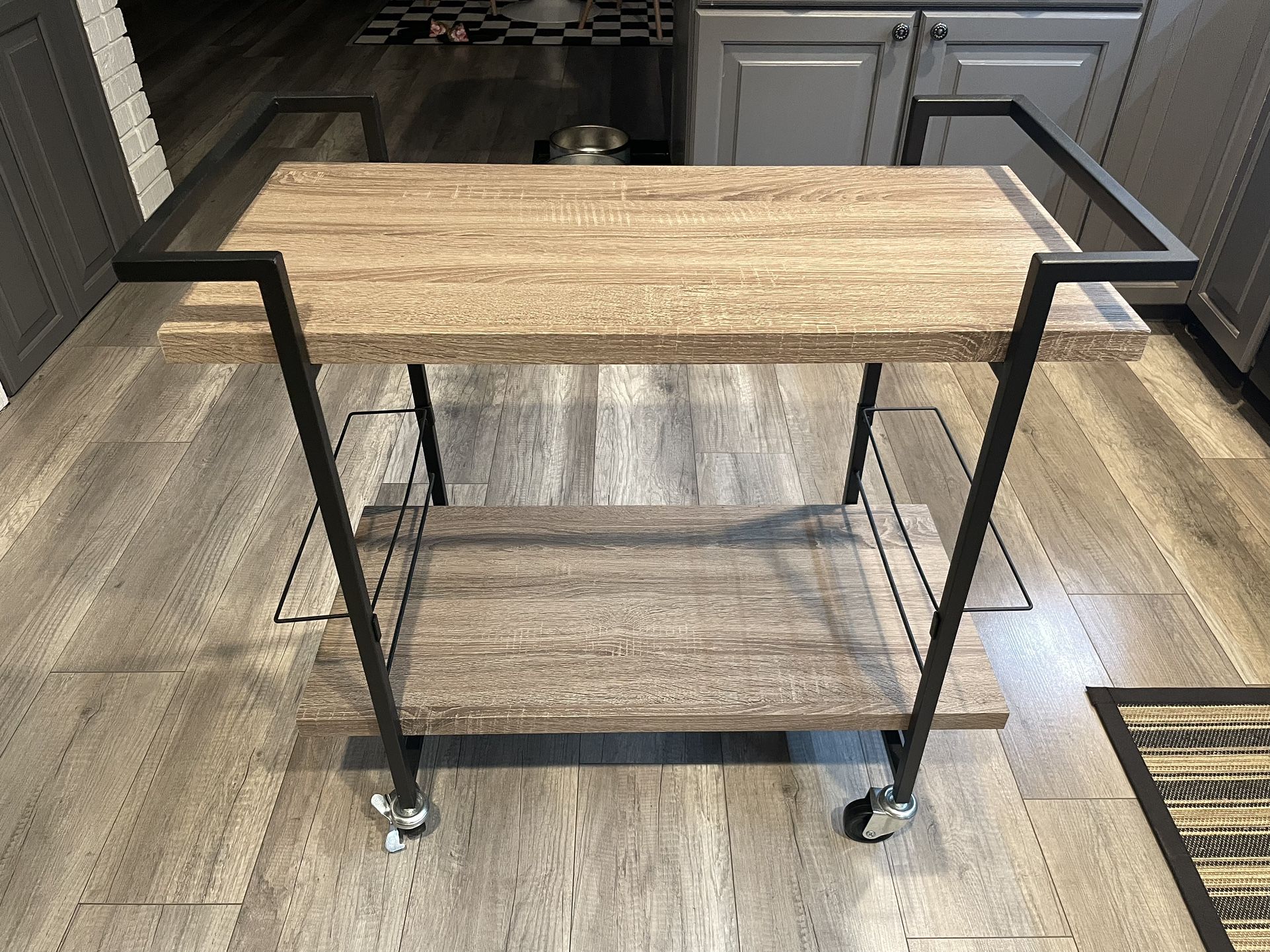 Weathered oak color, 2-tiered rolling bar cart It was lightly used, it’s in perfect condition! No scratches. Locking wheels 6 bottle side storage capacity Handle/towel rack 32.3"D x 16.9"W x 32.3"H Asking $80 OBO. Must pick up.