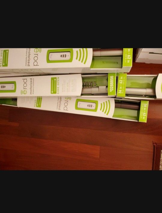 New never used erod 36-in to 62-in wide Curtain Rod with wireless remote. Experience the ease and convenience of opening and closing your drapes with the push of the remote button. Remote is included in each box. Drapery hardware Features Telescoping motorized drapery rod- adjusts from 36" to 62" wide. Easy to install, no hard wiring, just plug it in. Includes motorized rod, remote control, wall ou