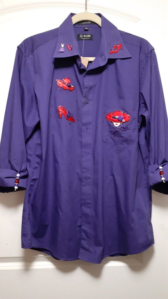 RED HAT SOCIETY WOMEN'S PURPLE BLOUSE. EMBELLISHED WITH RED HAT LADIES SHOES, HATS, ACCESSORIES DESIGNEDINITALY .