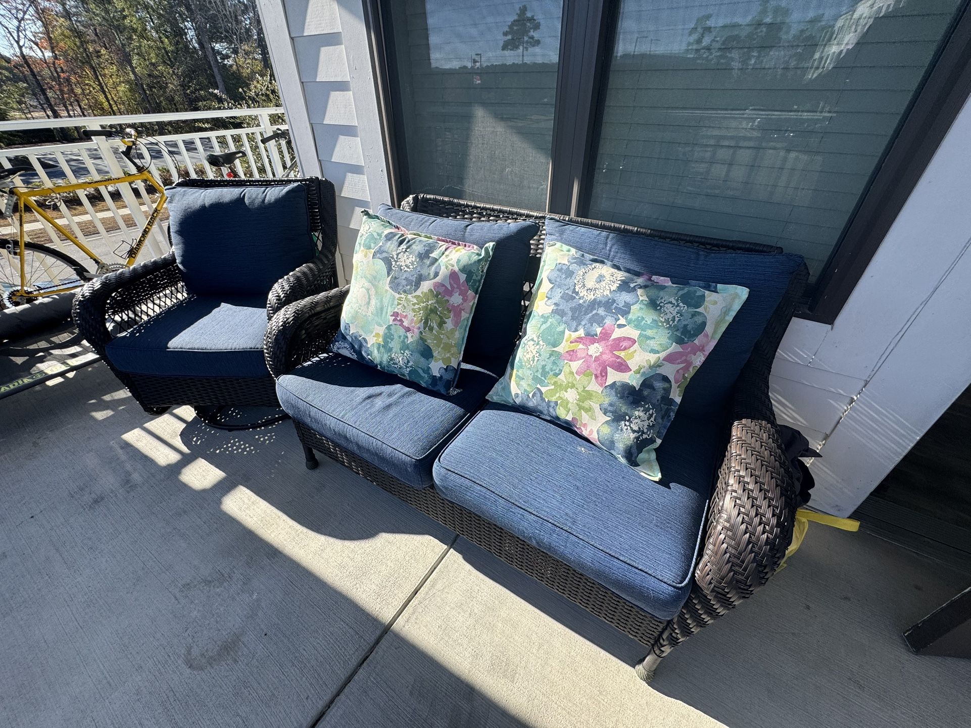 Beautiful two piece outdoor/patio furniture set - blue cushions, brown wicker. Like new condition - swivel rocker chair and two seat couch with two floral pillows.