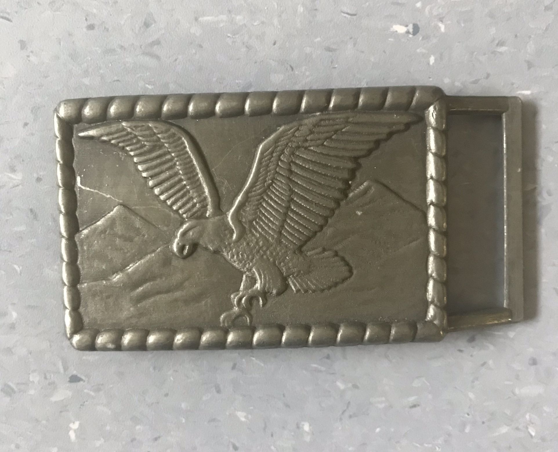 Nice American Bald Eagle Flying Over Mountain Range Gray Rectangular Belt Buckle DIMENSIONS: 3" X 2" CONDITION: Some cosmetic wear throughout (please see pics) Please see the images for details if you place order, please assign A or B piece