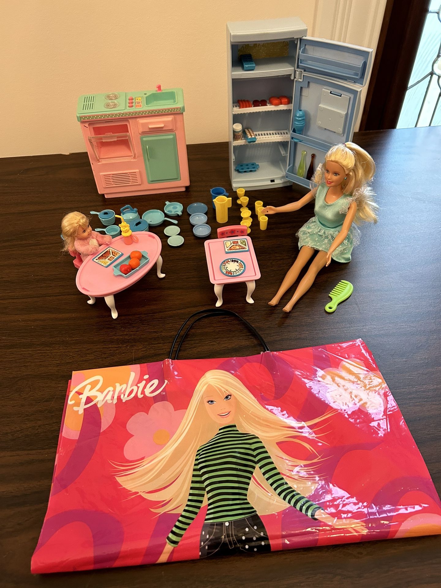This vintage, 1998 Barbie playset features, a blonde Barbie doll, long soft hair that can be combed with Kelly in the kitchen includes over 40 accessories that brings this world to life. The set features a refrigerator, a stove and oven with sink, two tables with two chairs and an assortment of pots pans, dishes, glasses, utensils, etc. Refrigerator is stocked with hotdogs, hamburgers, eggs, milk, soda, muffins, etc. all the accessories that allow children to engage in imaginative play. The set was manufactured in 1998 and the oven stove sink features sound and light of water running, a boiling pot and a timer for the oven all in good condition and in a Barbie bag