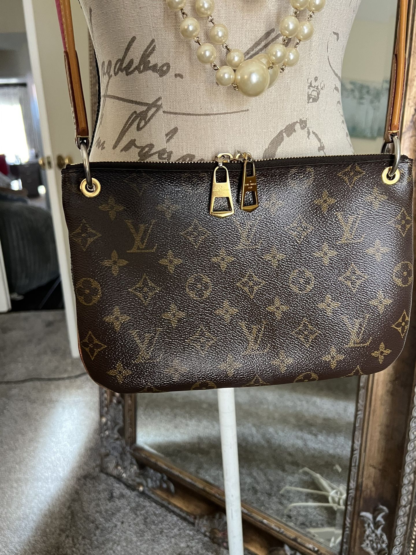 In Good overall condition, includes dust bag. From 2017 Collection- Very few of these on the market. It’s the perfect crossbody. Condition of Bag: Hardware: Good overall -hardware: Rings showing some discoloration. - Zipper pulls: No discoloration as zippers glide smoothly -Inside: No tears, has some stains from regular use - Strap: Has one small tear (will include a second strap in dark brown color) - Piping: In tact See pics for dimensions-