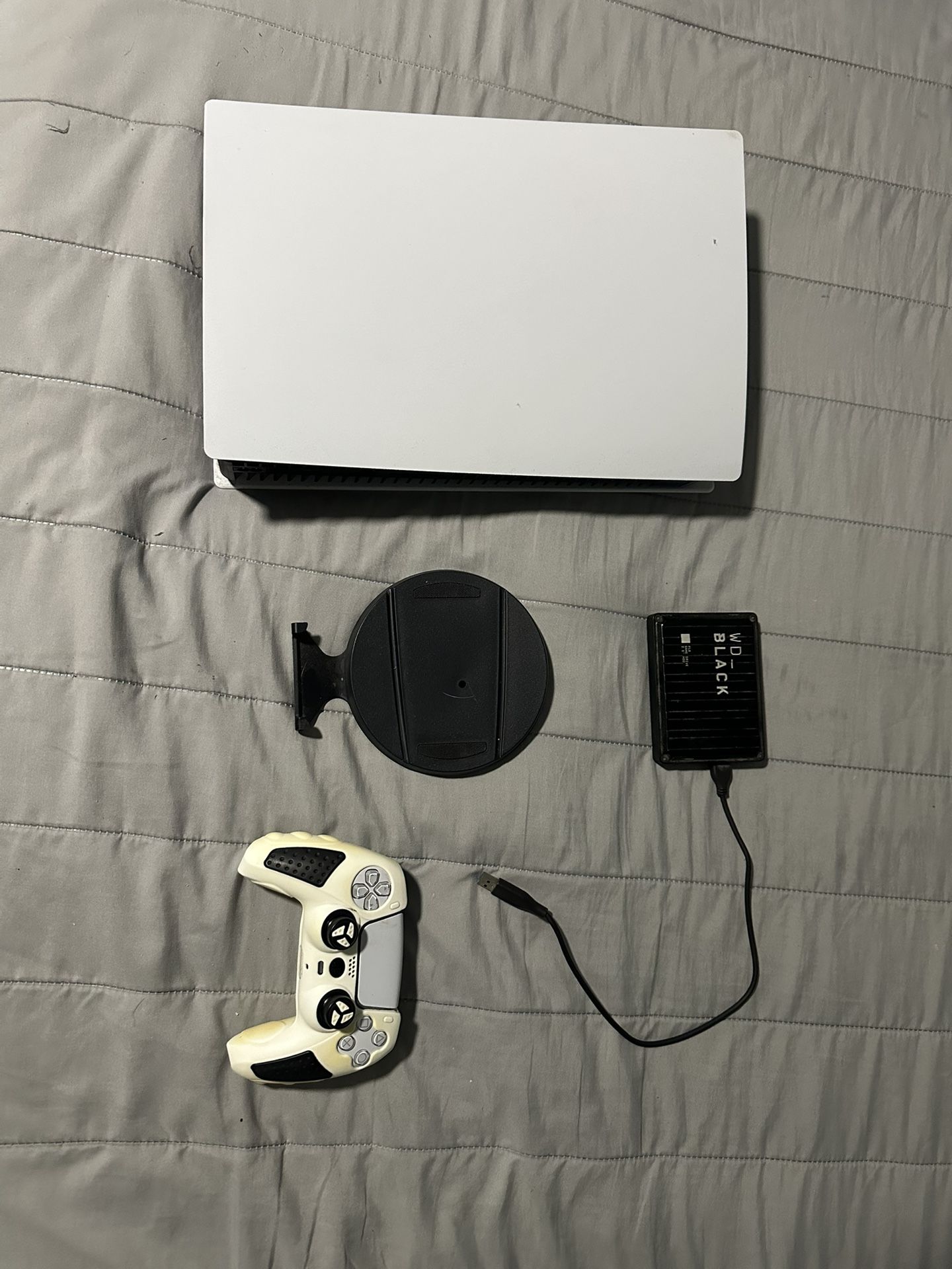 Hello im selling my ps5 mainly because im trying to build a gaming pc an i barely use it anymore. it works like normal stays quiet no damages comes included with the power/ HDMI cables i still have the console stand but im also throwing in a 3tb external hard drive controller works no stick drift i also still have the box but it is damaged from the top . im also available for trades mainly RAM ( Corsair vengeance RBG DDR5 32GB preferred )