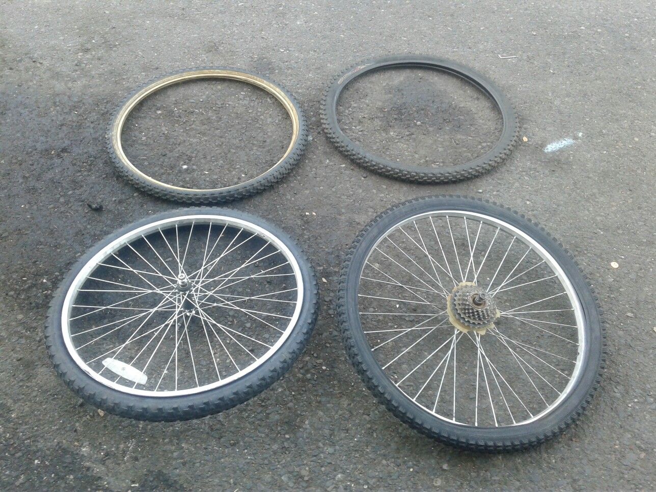 I have a front wheel, rear wheel, and spare tires, a bike frame, and seat. No tubes in tires. Make offer on everything, with a couple of tubes this is a complete bike