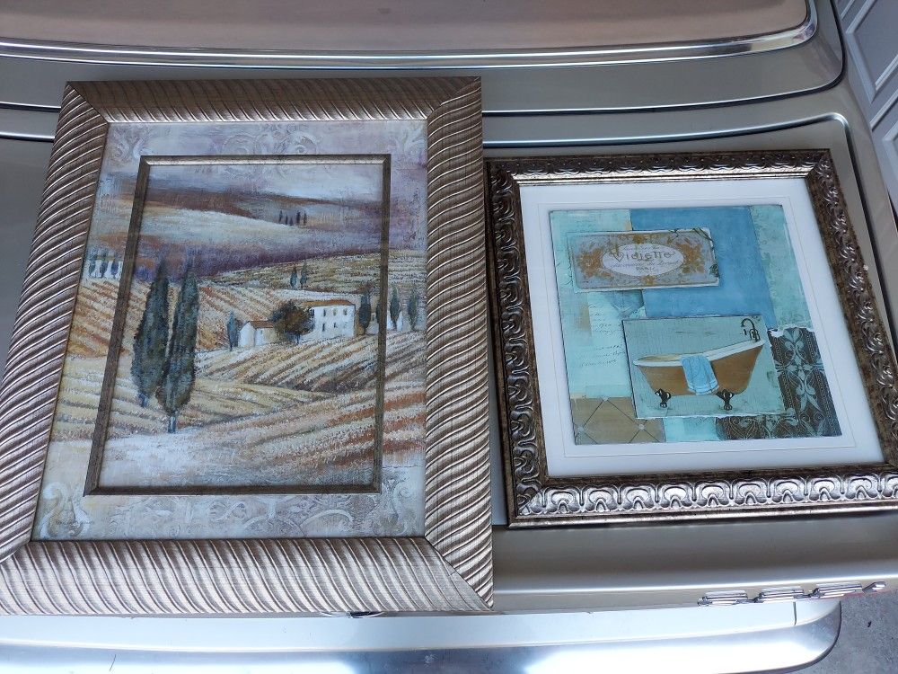 2 pictures for $5 each. Both famed and matted with silver patina. Large is 21x25 and smaller is 18x18.