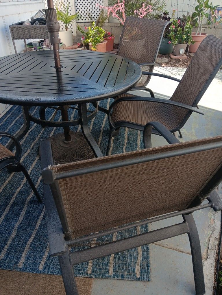 Dark finish, quality canvas umbrella CHAIRS- woven seats and back, metal base and structure Strong, heavy metal Bought at Rogers Gardens in Newport Beach Top quality
