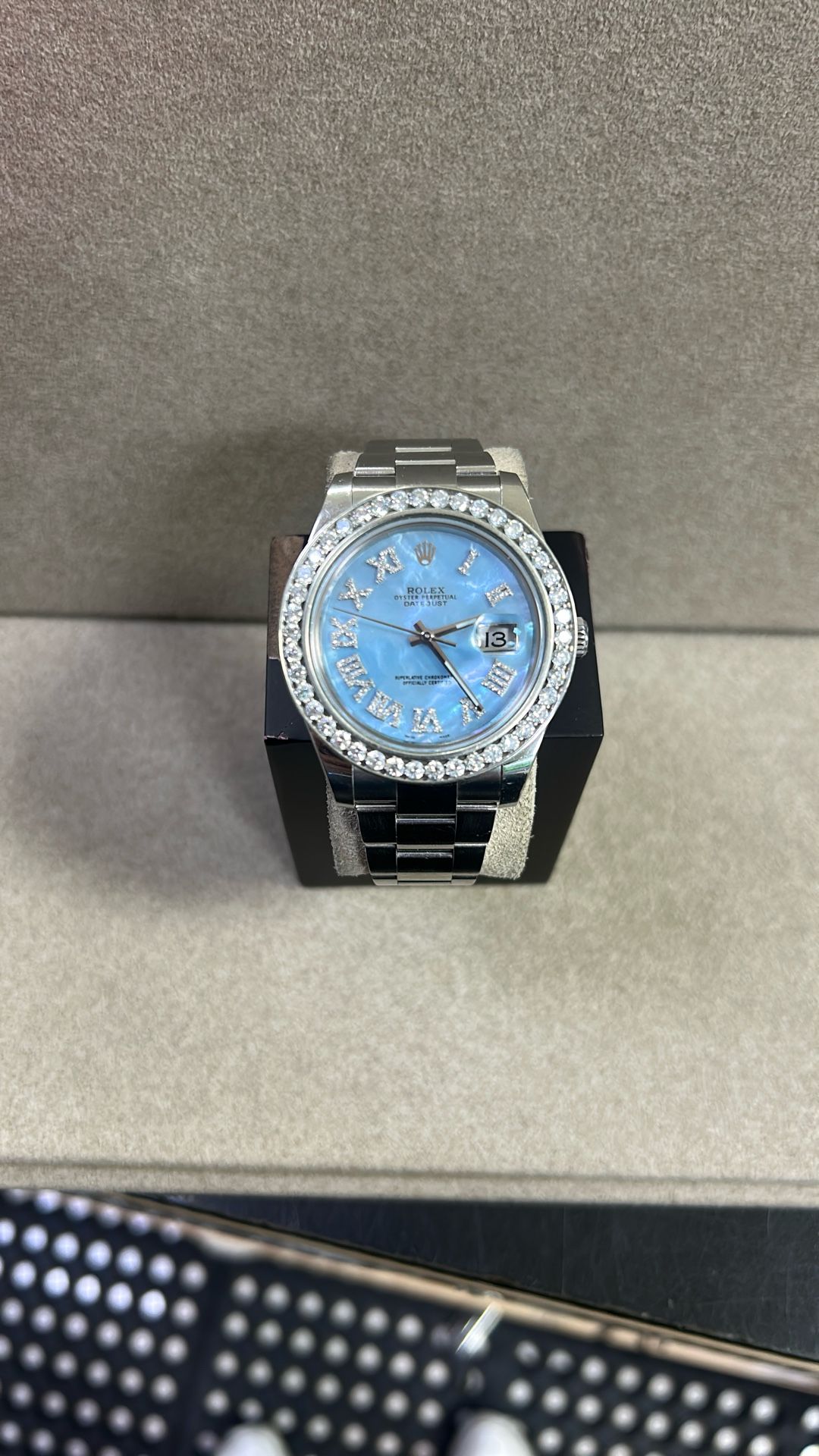 Model : 116334 Silver oyster bracelet with silver bezel blue mop dial 41mm Has diamond bezel 3 carat Roman numeral Grams : 143.69 No box or papers