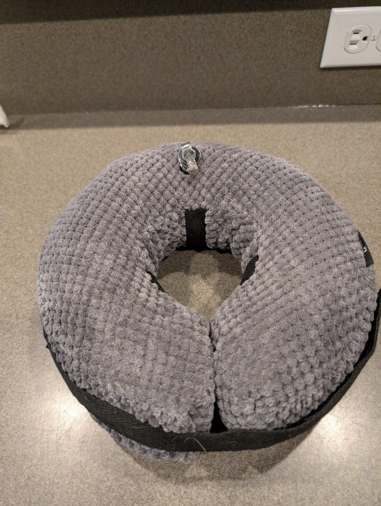 Selling a brand new, never-used Inflatable Dog Recovery Collar. This is the comfortable "donut" alternative to the plastic "Cone of Shame" for pets recovering from surgery, wounds, rashes, or hot spots. This collar prevents pets from reaching injuries on their body while allowing for full visibility, and making it easier for them to eat, drink, and sleep comfortably. **Features:** * **Condition:** Brand New, Unused. * **Comfort:** Soft, plush velvet-like exterior. Much more gentle on furniture and walls than plastic cones. * **Easy to Use:** Inflatable design (uses a standard tire/bike pump or mouth) with a simple Velcro strap for secure closure. * **Style:** Neutral gray color. * **Size:** [**INSERT CORRECT SIZE HERE - e.g., Medium**]. Typically fits necks measuring [**INSERT NECK RANGE HERE - e.g., 12" to 18"**]. A must-have for peace of mind when your pet is healing!