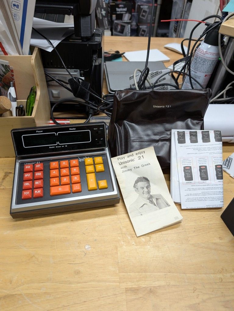 Vintage blackjack counter with manuals, and cover with printed Jimmy the Greek signature. The calculator works. Unsure if the game works seems semi functional.