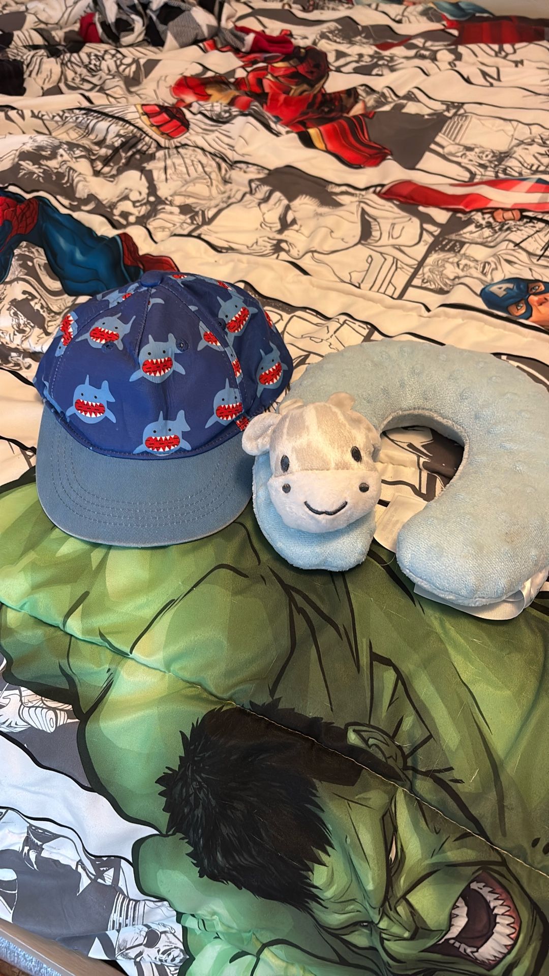 This is a blue shark toddler hat. This will fit a little guy maybe 1t-3t. Stains in bill I washed but didnt try too hard to get off so may come off still. Shown in pics. Blue little giraffe baby neck pillow. Good for car rides to keep safe or in a plane for a little guy to sleep on.