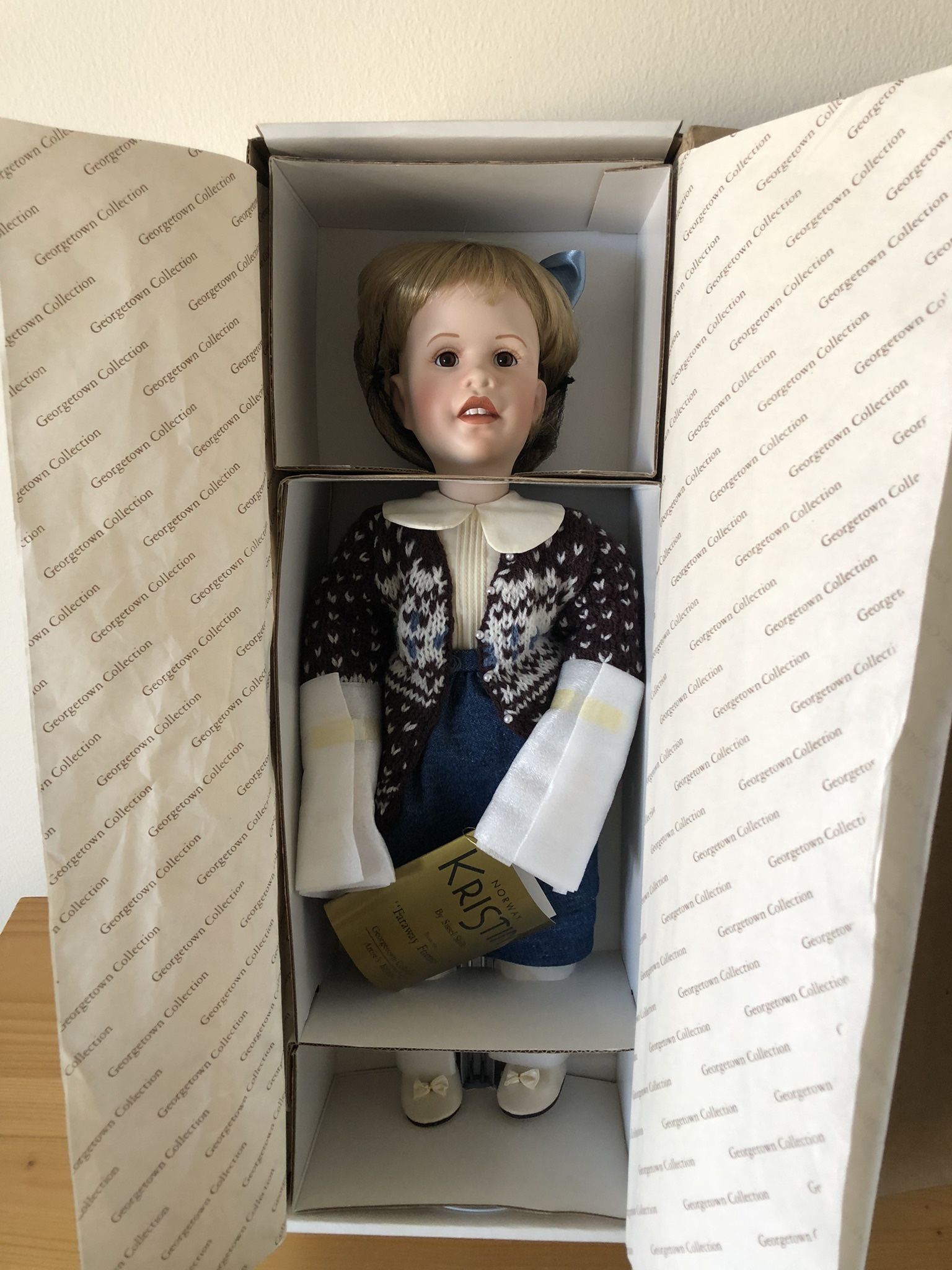 This doll is from the Georgetown Collection and is a character named Kristin from Norway, as indicated by the "Kristin Norway" booklet she is holding. She is dressed in a traditional Nordic-style Fair Isle cardigan and denim skirt. Porcelain head and hands. [Comes in box with certificate] *Cash only*