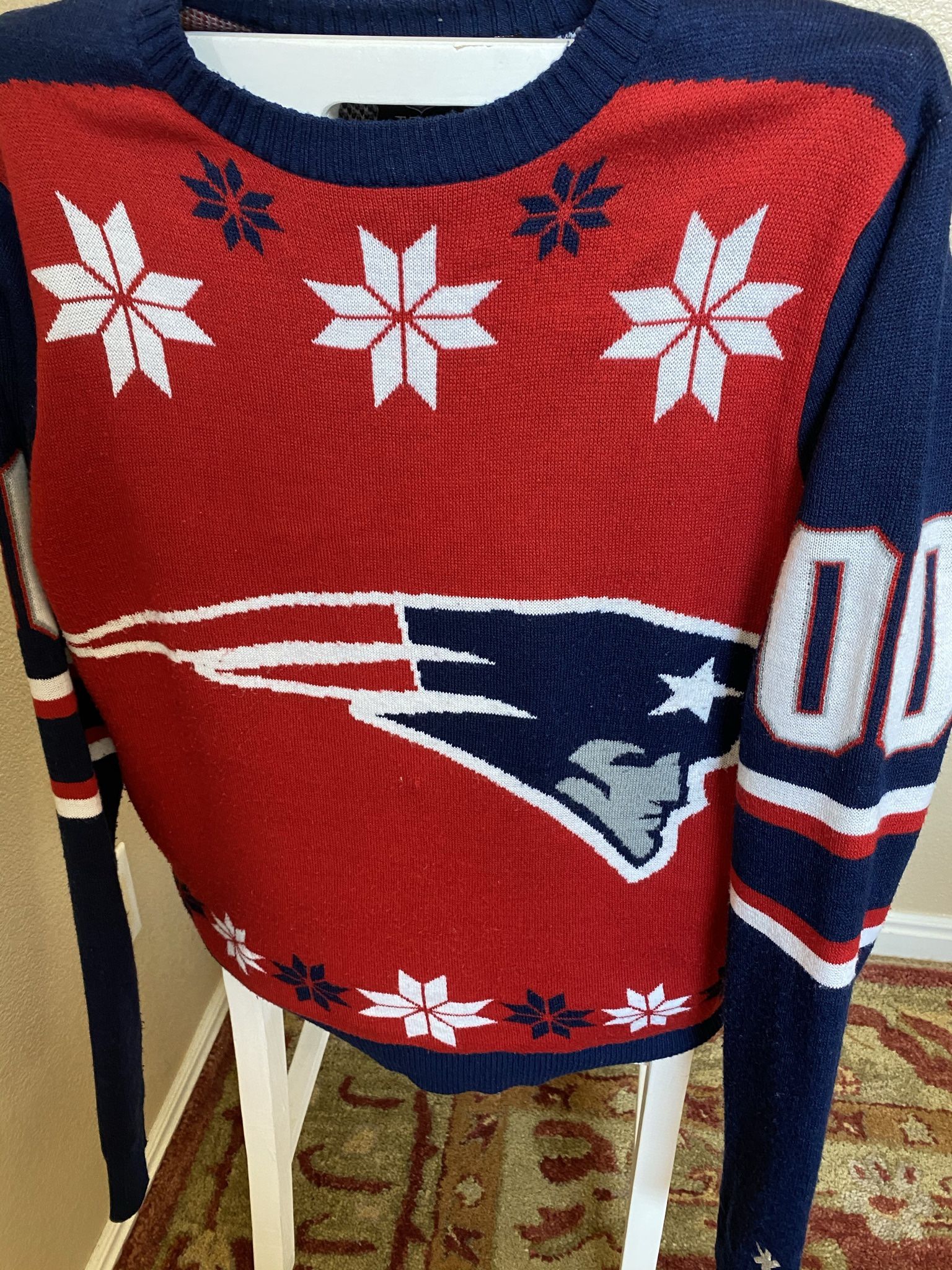 Support your Patriots New England Patriots NFL red, white & blue Logo Sweater small/Medium depends on body type. (excellent condition) Patriots celebrating the 6 time Super Bowl Champions & contenders for #7