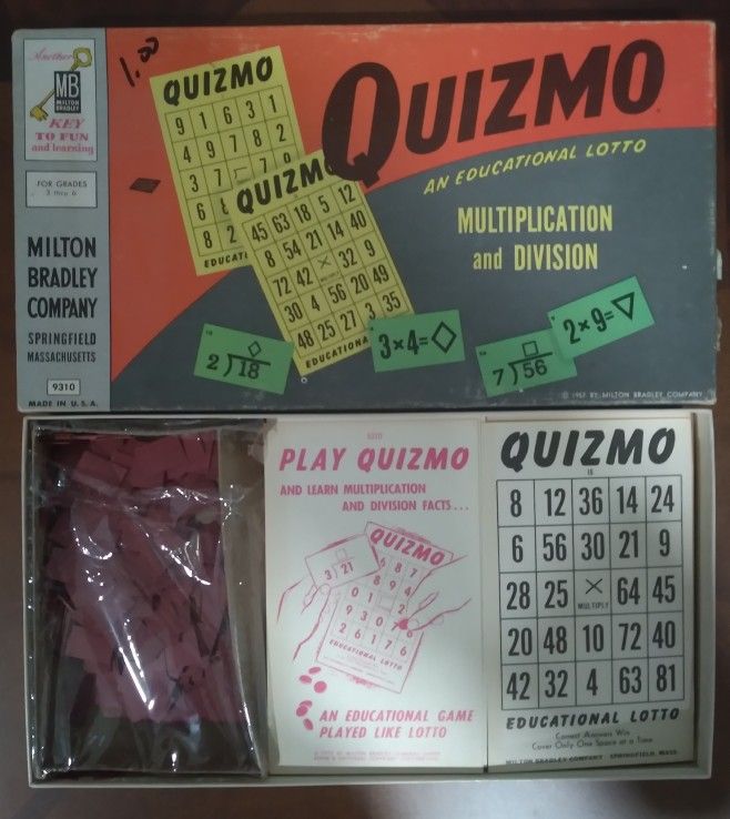 The following item is the Quizmo: Multiplication and Division lottery-based educational game released in 1957 by Milton Bradley. The item is in very good condition. Thank you.