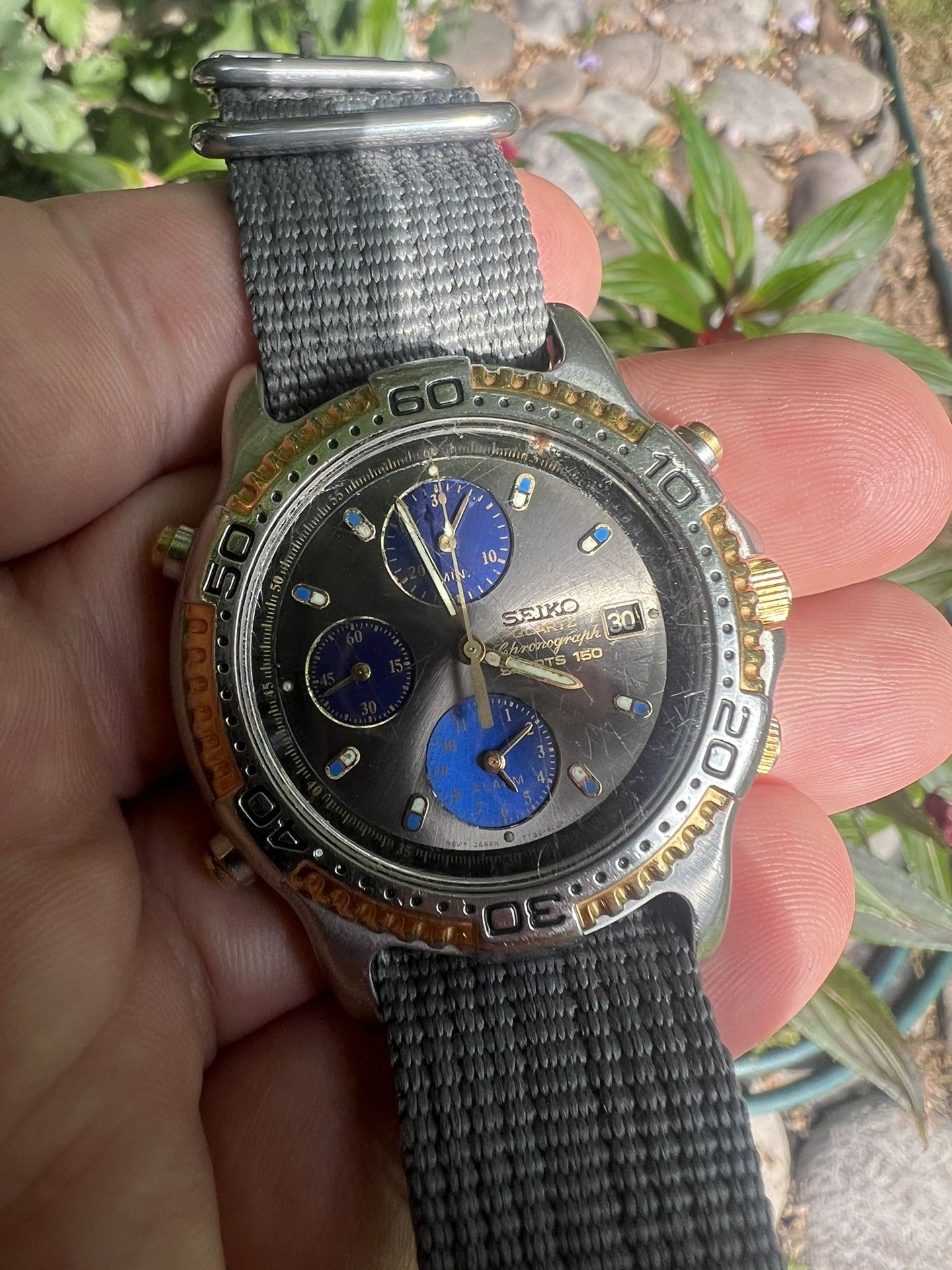 This vintage Seiko Chronograph wristwatch is a true gem for collectors and sports enthusiasts alike. With a unidirectional rotating bezel and a striking gold or silver case finish, this watch is both stylish and functional. The stick indexes and gray dial color make for easy time reading, while the one-piece strap ensures a comfortable fit for wrist sizes between 7.6-8 inches. This watch is water-resistant up to 150 meters and features a quartz movement, making it a reliable timepiece for any occasion. The screwback caseback and 10 mm case thickness add to the durability of the watch. Manufactured in Japan between 1(contact info removed), this Seiko Chronograph is a rare find that is sure to impress any watch collector. Watch has some scratches on crystal and on watch case please see pictures. Sold as is
