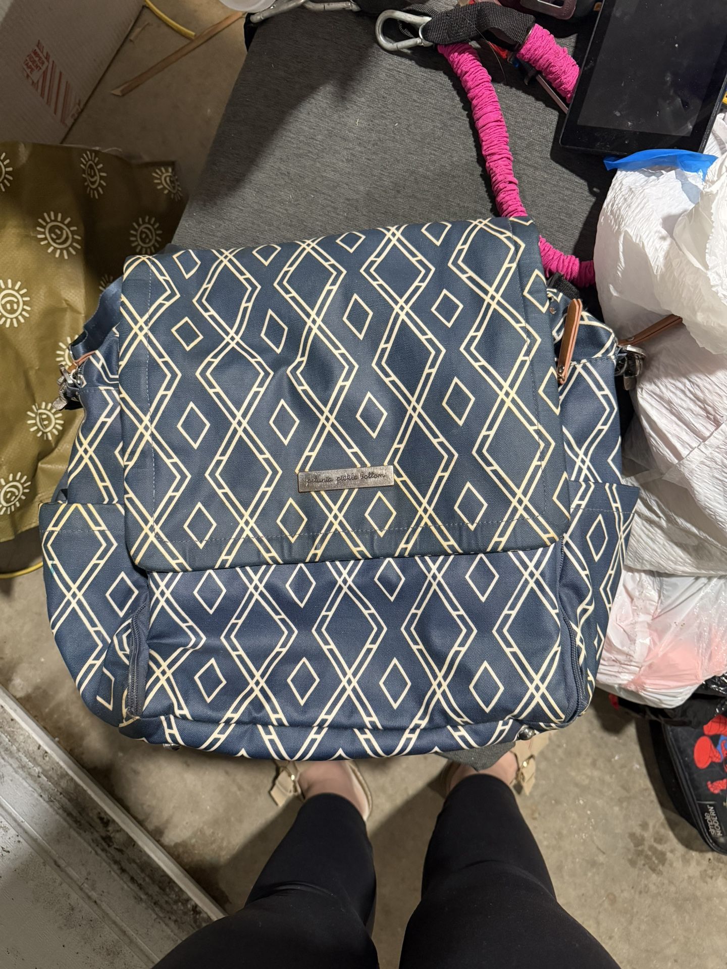 In fair preowned condition Was a very used diaper bag but still in usable condition Lots of space and storage Changing pad is detachable Has stroller/cart straps Cash only
