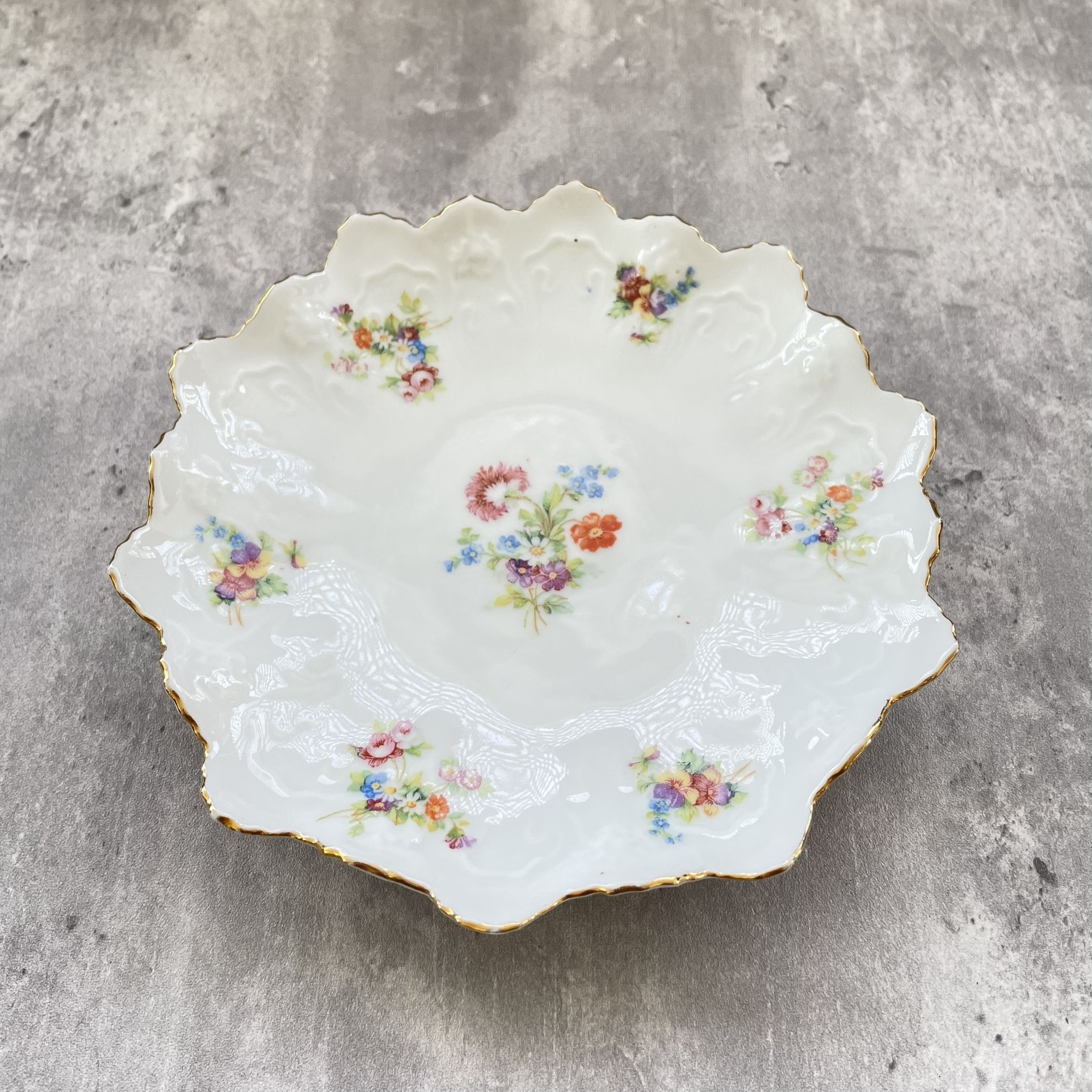 Antique MZ Altrohlau CMR Czechoslovakia is for Starorolský Porcelán Moritz Zdekauerdating c1916-c1939 Small floral saucer, scalloped edge 6” Excellent condition, no crack or chip