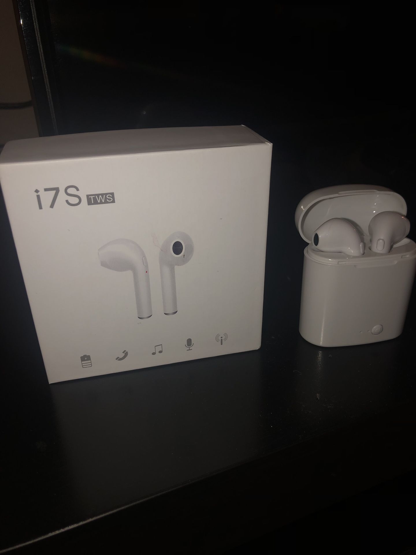 Brand new in its box. Very alike apple airpods. Works with any bluetooth device, works with any phone. excellent sound. Battery last up to 6hr nonstop. Brings charging case and usb charging cable. Excellent for workouts or jobs.This is not apple. Located in coral gables