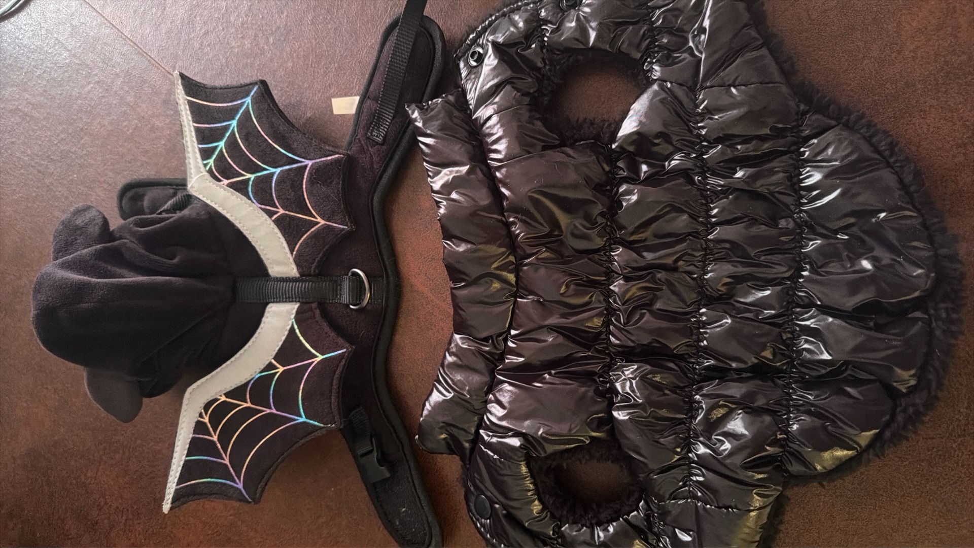 Bat costume from Petsmart the wing are light reflecting. The vest is PVC and fur lined.