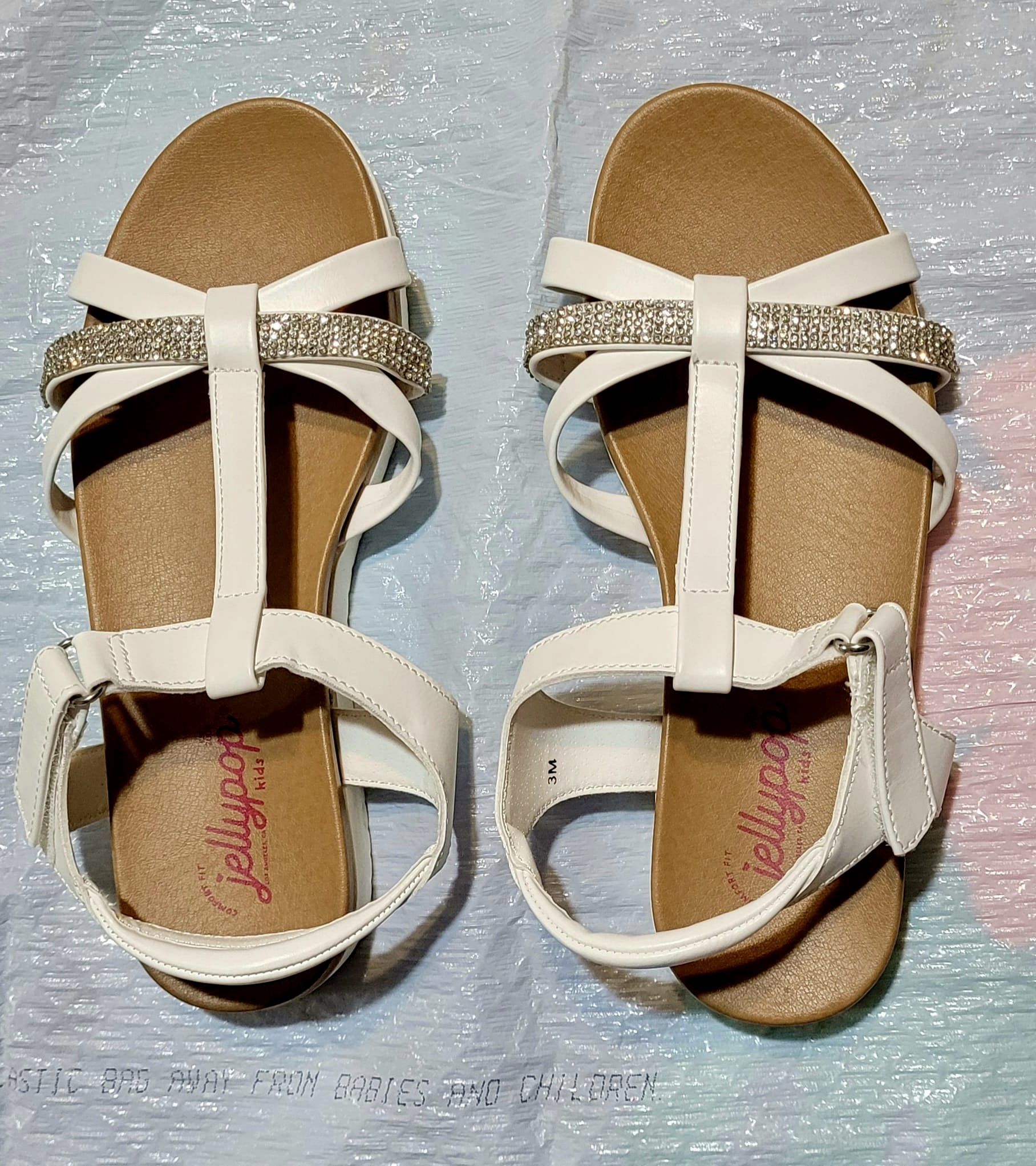Jellypop girl sandals with white straps and silver rhinestone accents. Ideal for casual outings. This strapping pair sports a cushy footbed for some extra padding and support. Size: 3M New