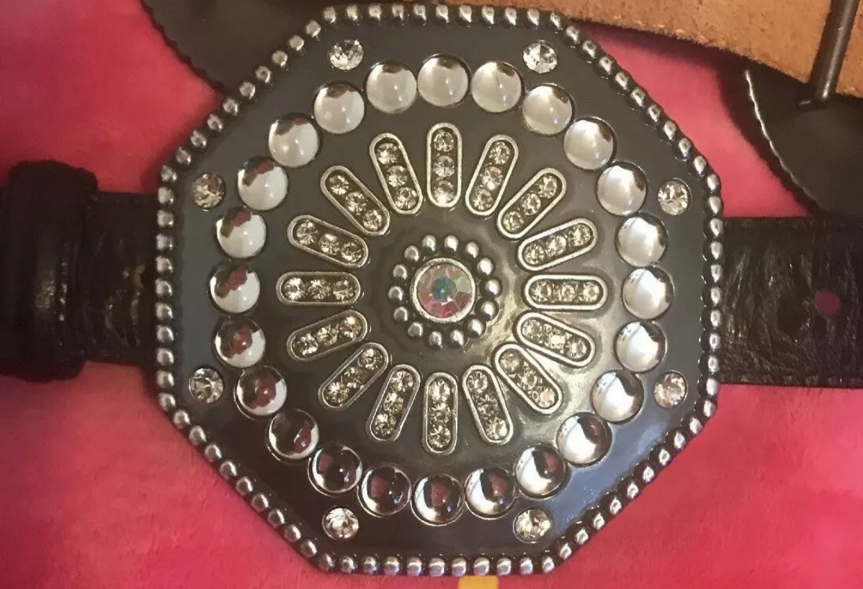 Original Tony Lama Medallion Belt Strap is black leather. Medallions are dark gray with rhinestones. 8 medallions plus Buckle in hexagon shape Never used!!