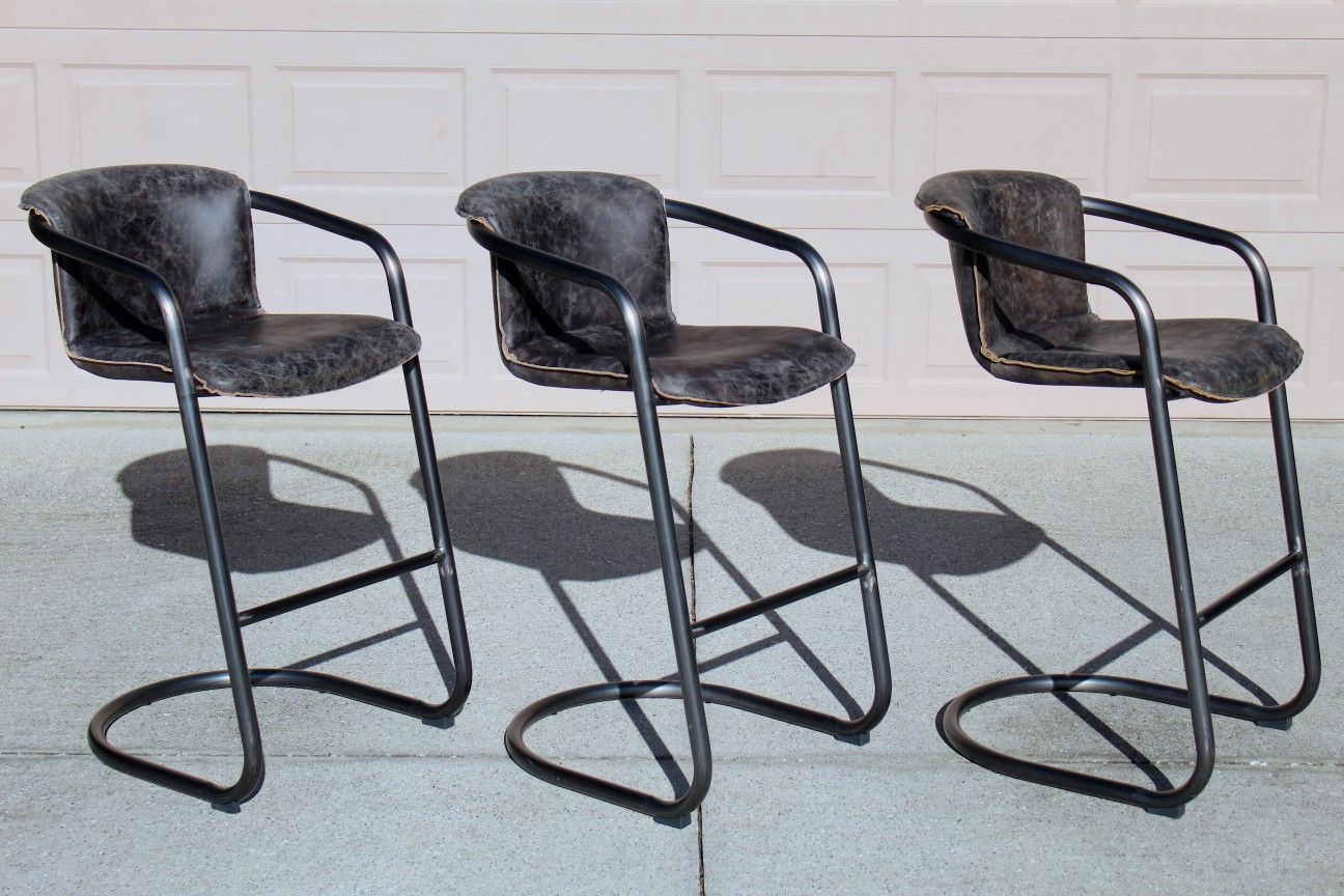 Set of 3 Leather Bar Stools – Industrial Style – (Value $1,500)