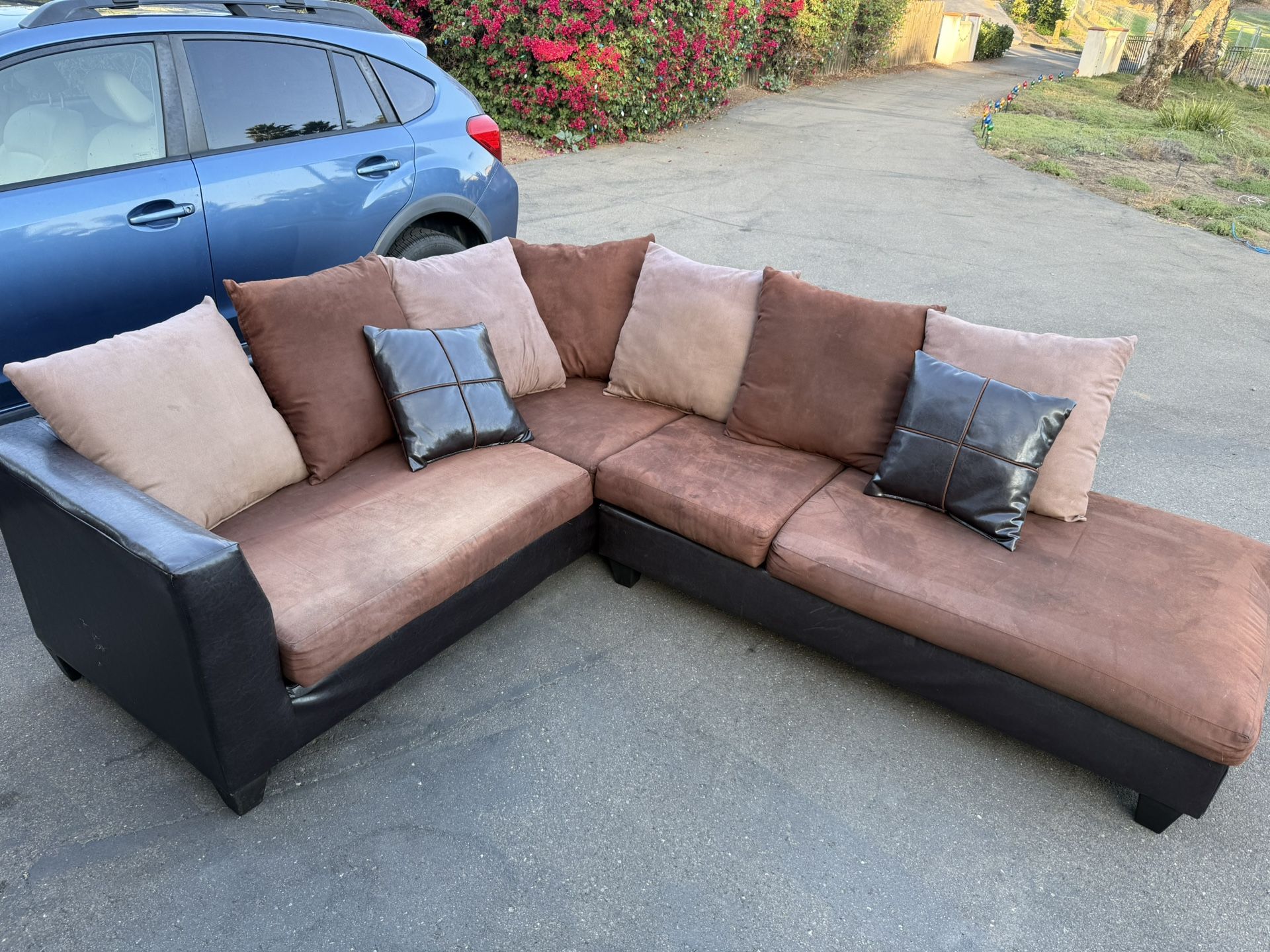 L shaped couch that is disconnected in the center. Chaise lounge on the left side. Small tear on the chaise side which can be covered with a pillow (see photo). Right side cushion slightly faded. Dimensions: One side 103 inches long, other side 83 inches long, 35 inches wide, back is 28 inches high