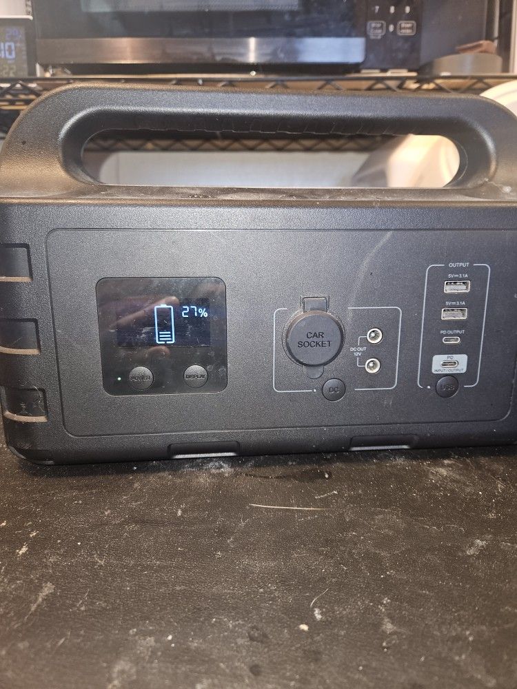 ONN power station. 120v 200w output, USB-C PD input/ output, 12v and car output, 2x USB-A output. Can be charged via USB-C or included power cable. Has built in radio and Bluetooth speaker.