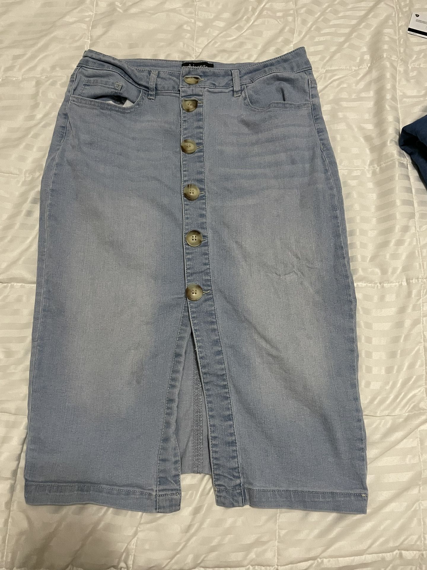 It’s been used multiple times, all buttons are still in place. has a slit slightly above the knees. over all still in good use