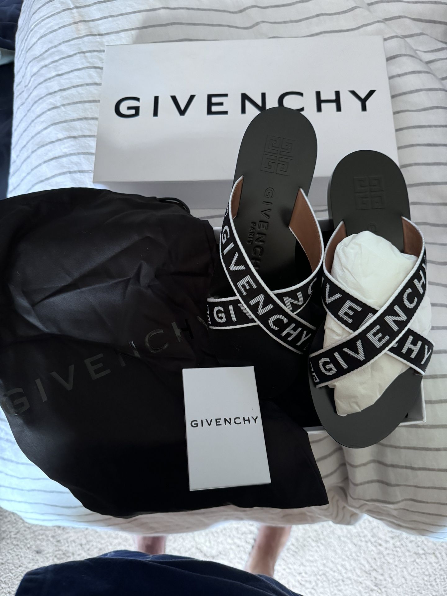 Black leather sandals by Givenchy. Logo on the sole and straps. Low, flat heels with fabric straps. Made in Italy. $700 new. Serious inquiries only please.
