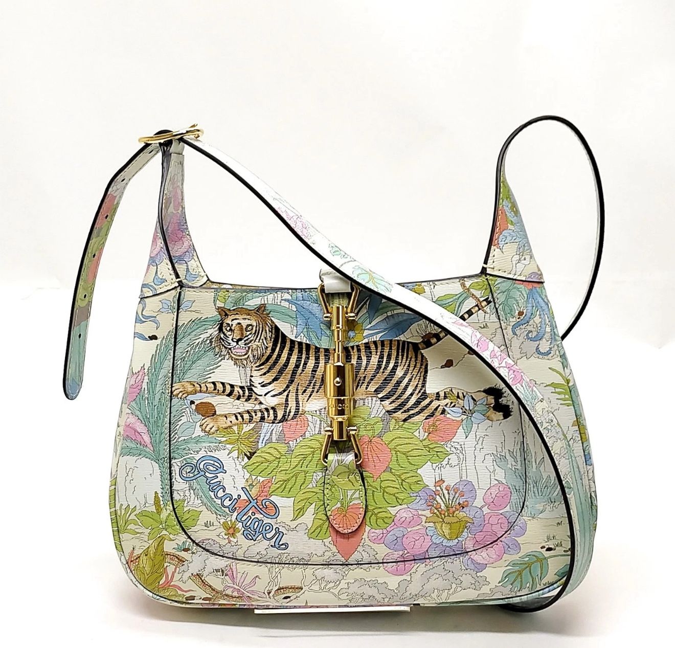Authenticated Gucci Yuko Higuchi Small Calfskin Floral Print Jackie 1961 White
