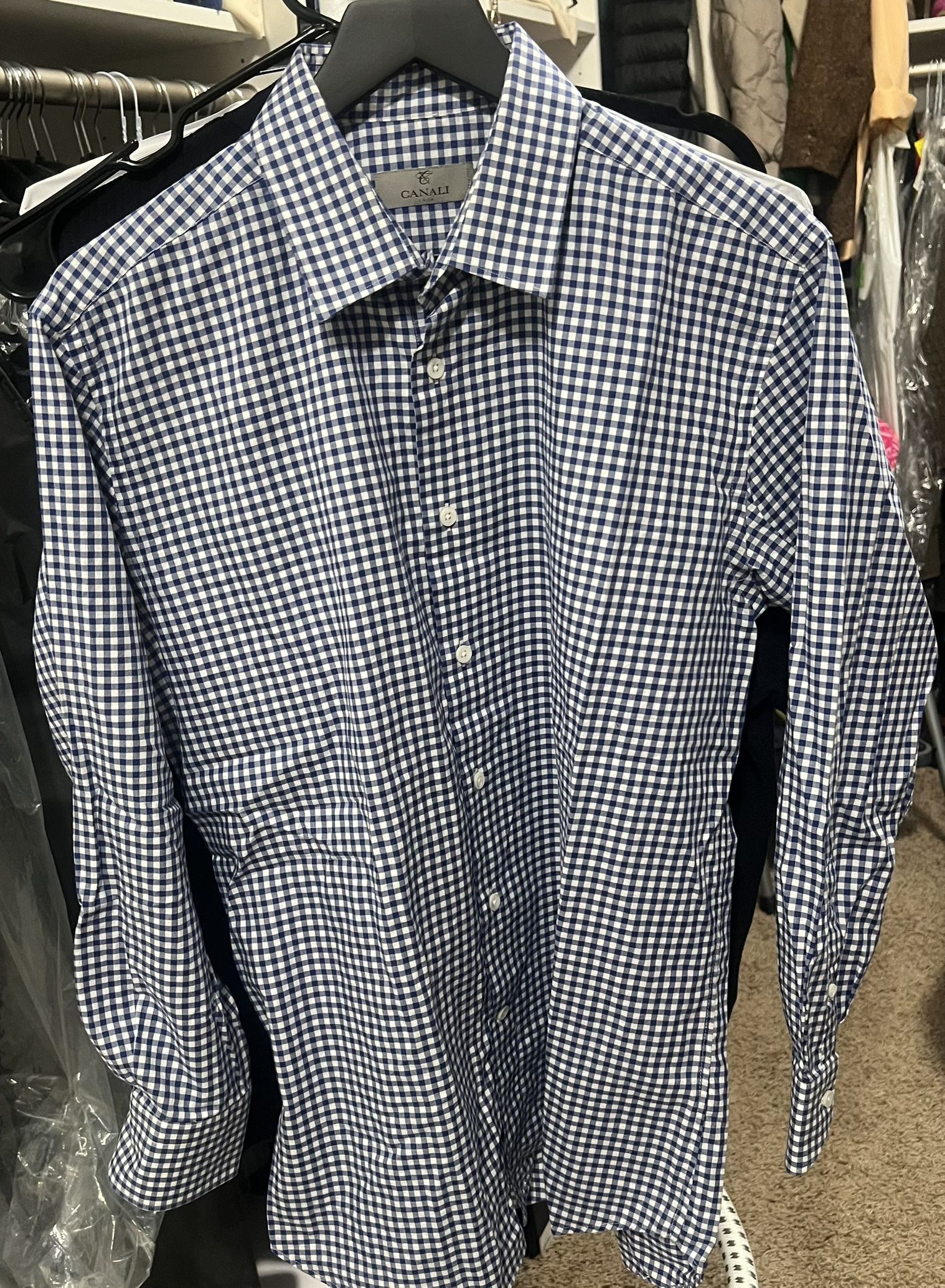 Canali Men's Blue White Gingham Cotton Dress Shirt 43 17 Long Sleeve Collared