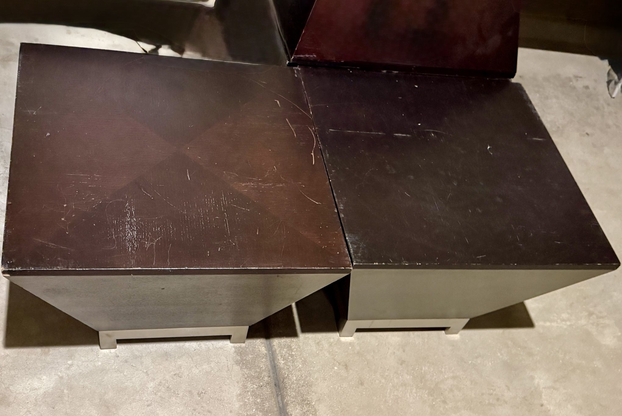 2 Solid Wood Square Top Modular Wooden Coffee Side Tables (Set Of 2 Tables). Yes, they are available. Condition is Used / Good. Very strong, sturdy and heavy tables. These can easily be sanded and stained to look brand new. Great DIY project! Pick up in Hoffman Estates, IL 60192.