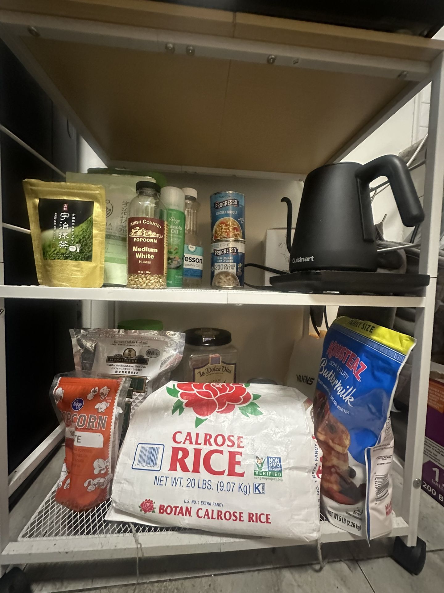 White Rolling Utility Cart with lockable wheels for Kitchen, Office, or Home. Can fit a decently large microwave. Products on cart for display/illustrative purposes only. Holds up to 90 lbs on the top / 60 lbs on the two bottom levels. Measurements: 24 in. x 16 in. x 30 in. $35, OBO