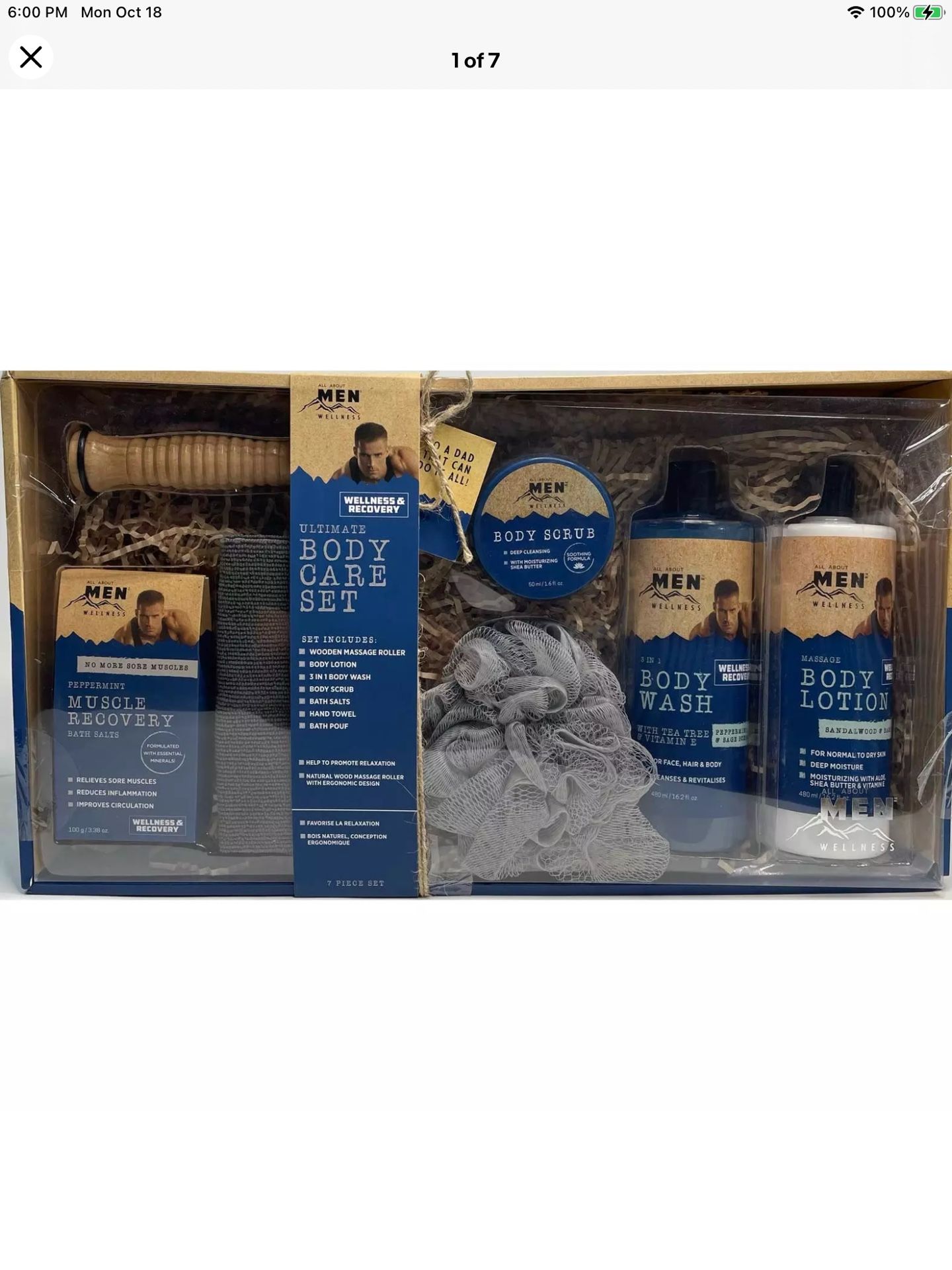 Christmas is right around the corner this would make a awesome gift this is the ultimate body care set come with a wooden massage roller and body lotion and 3n 1 body wash and body scrub and bath salts and a hand and a hand towel and a bath pouf brand new in package