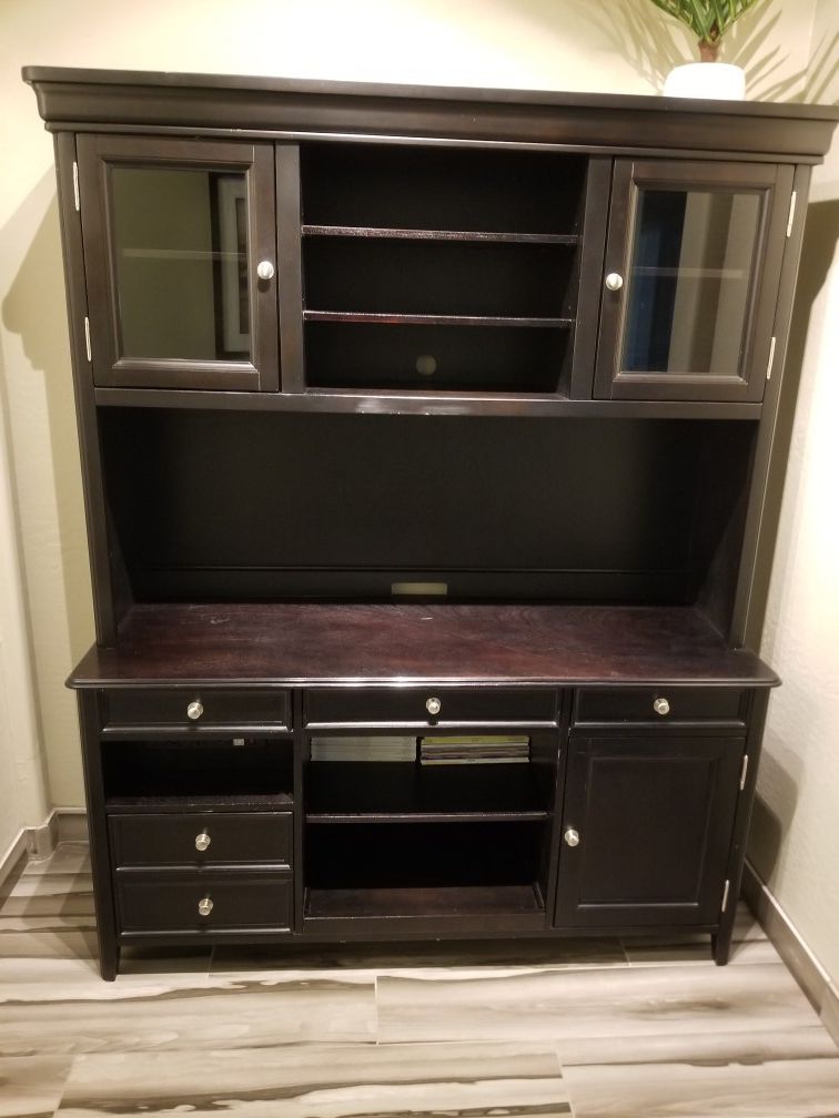 Dimensions: 61" W x 76" H x 22" D Solid wood. Quality made. Office desk and hutch. Color is a dark espresso, almost black. From a clean non smoking home.