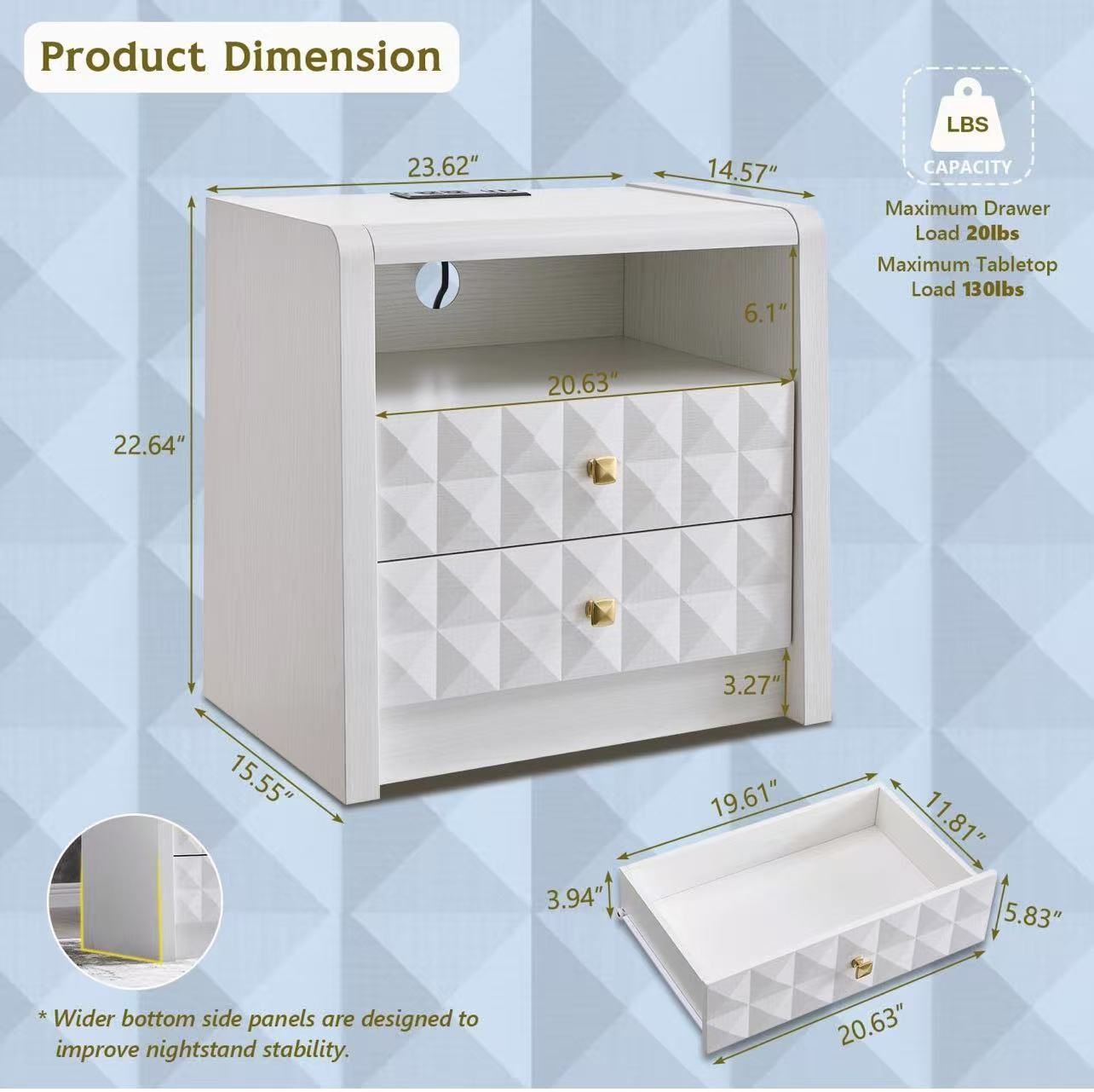 Modern Nightstand with Charging Station, Wood End Table w/2 Storage Drawers and Open Shelf, Mid Century Modern Bedside w/Diamond Panel Decorate for Bedroom, Curved Profile Design, White 🙏pay $65.00 + sale tax by cash or card in person (final sale). ✌️Not Accept price negotiation through thIs OfferUp App ; The price is as marked ✌️Pick up at showroom : zip code 80231 or 80223 or 80241 depending on item ✌️Hour : from 10 am to 7 pm(Monday CLOSE) ✌️Pick up only, No delivery , No shipping ✌️please stop by ASAP after all info(including address) provided OR ✌️double confirming “available or not” again if the address info is already provided for days.. 🙏can NOT relocate inquired item to other showrooms but you can wait to see if it is available in other showrooms (current item location zip code can be distinguished by 🥨😀✌️) ✌️ ALL furniture are new and not used at all. However, due to few careless or overweight handling during shipping, transport or assembly, few of them will have mild scratch or dents. So does some inventories in the box. We try our best to photo those in pictures after assembling them. The price is adjusted based on those issue that we notice. ✌️ Item sold as the picture (it is assembled ) or it will be mark as in the boxes 🙏NO RETURN, NO REFUND, NO EXCHANGE