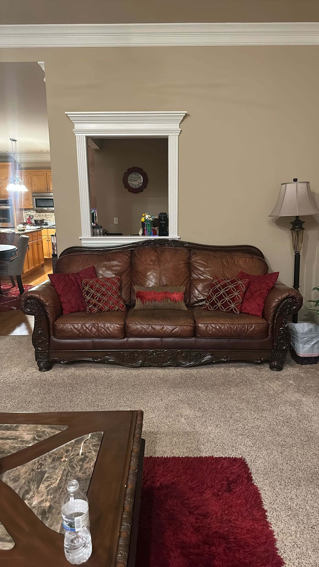 Ashley Furniture; 3 Brown Leather Couches, 2 Brown Accent Chairs, Marble And Wood Table And One Side Brown Coffee Table.