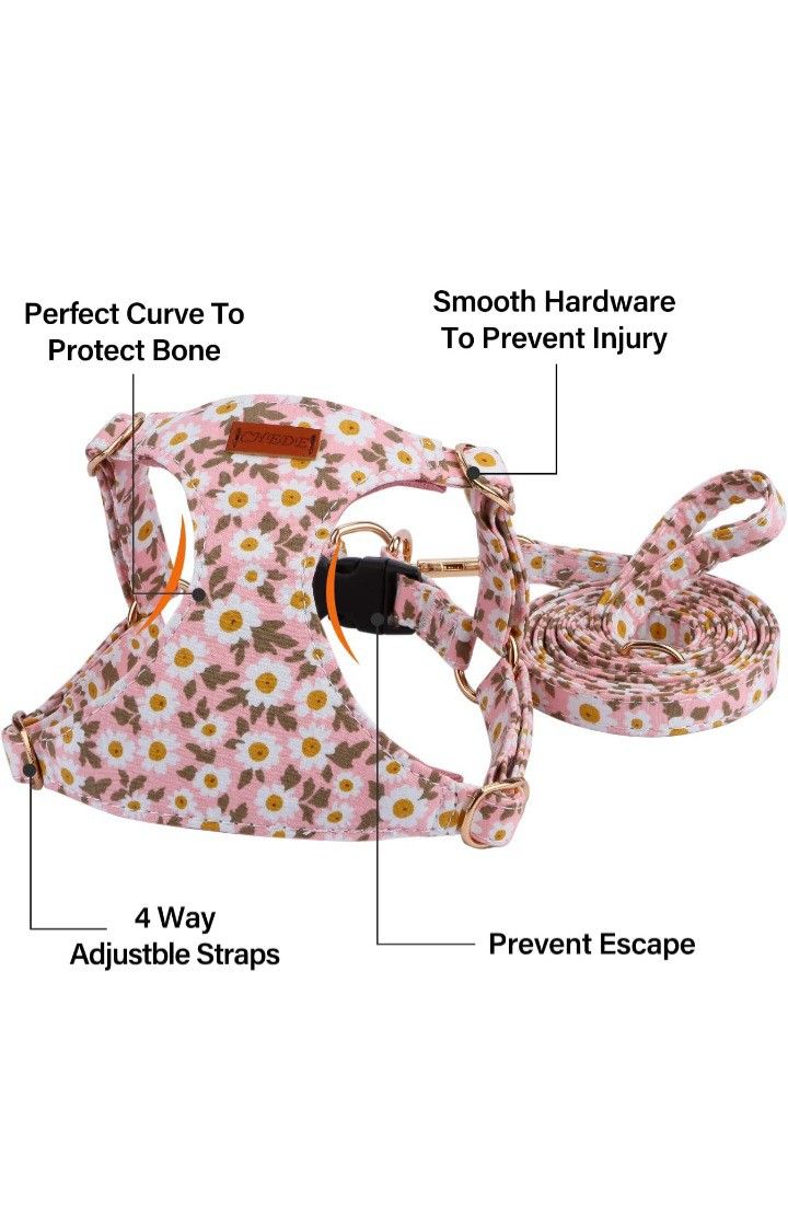 Brand New Floral Pattern Puppy Harness Soft Adjustable Dog Harness Vest and Dog Leash Set No Choke Escape Proof Color Pink Daisy Size . SMALL