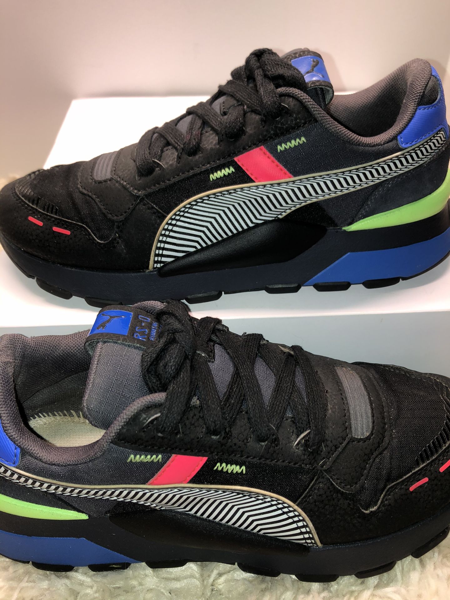 Puma RS-0 Running System shoes. Black with multi color patterns. See pictures for wear. Size 6 men, youth, size 7 women, preowned. All sales final, no returns. Please view my other listings for more like this.