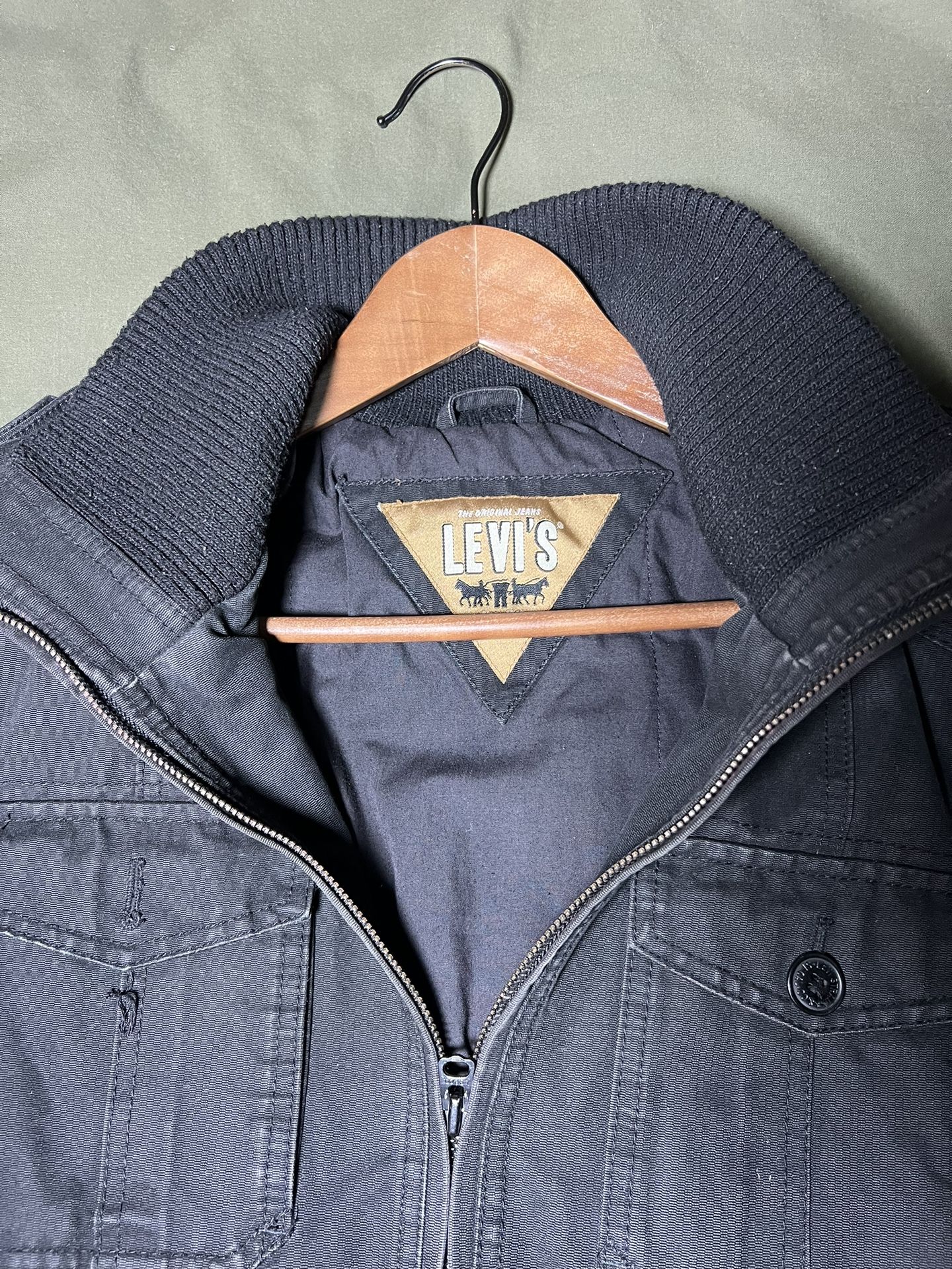 Vintage Levi’s Black Denim Jacket size large. Great condition. Has a couple of missing buttons. One of the buttons is in the jacket pocket.