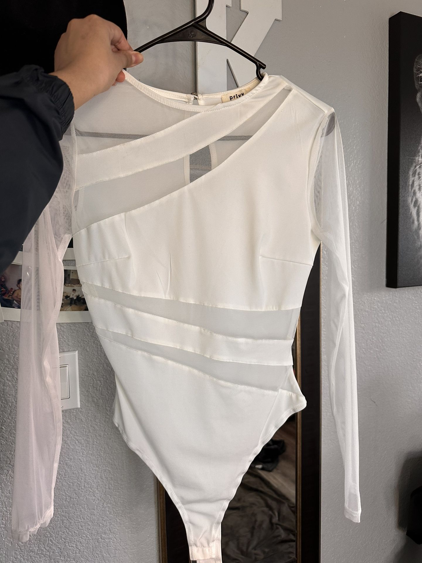 Never worn , does have a smear on back of shirt Size Medium white Bodysuit
