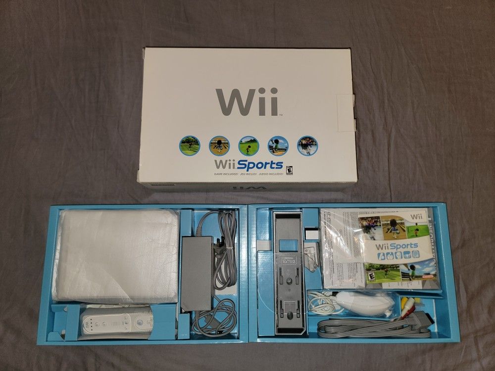I have a complete original, in box, Nintendo Wii. It comes with one controller, original RCA cable, and original power supply. As well as all of the documentation and a copy of Wii Sports.