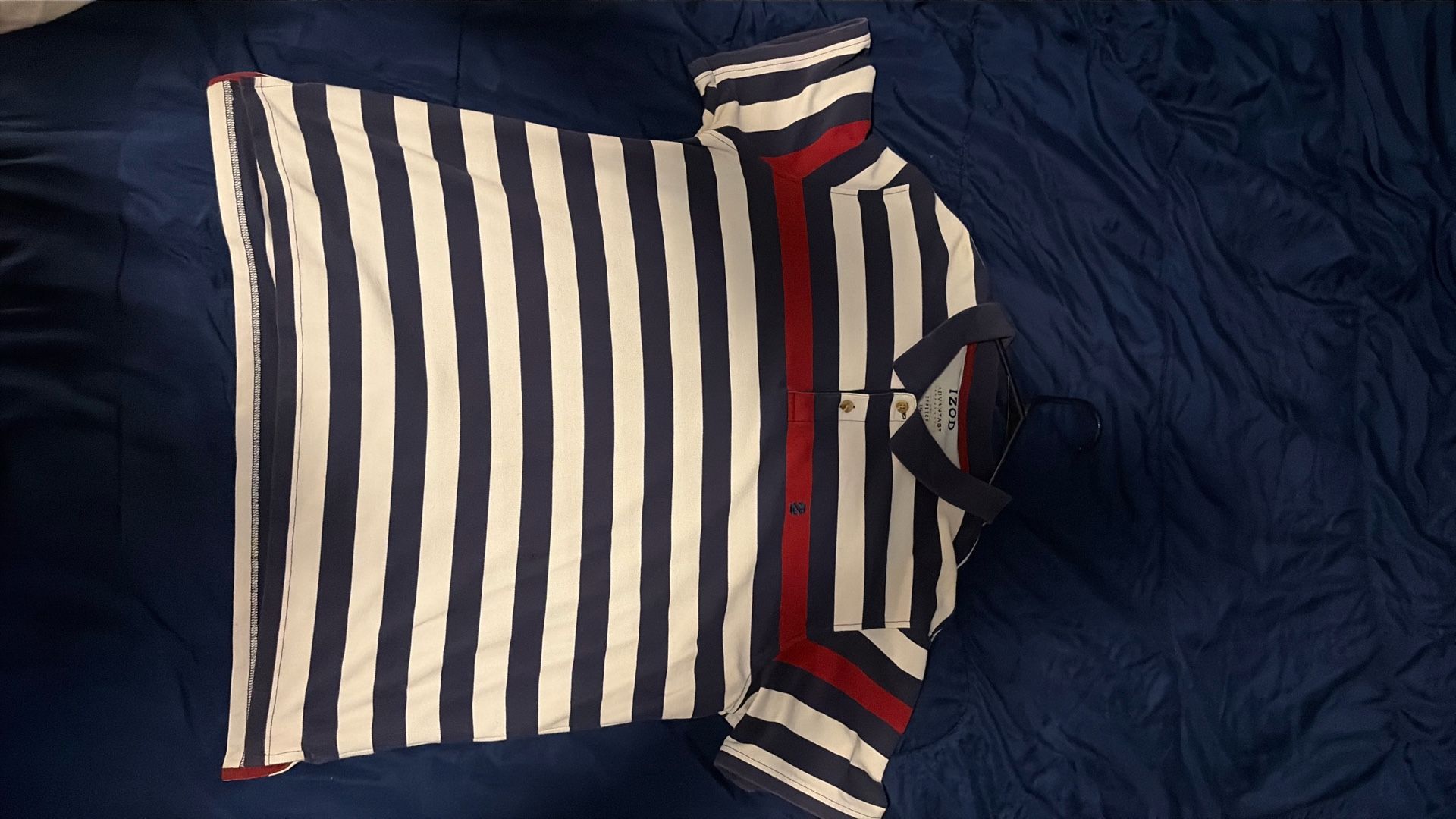 Fresh Izod polo in crisp navy & white stripes with a bold red accent stripe across the chest. Three-button collar, soft cotton blend, and that little embroidered logo on the front give it a clean, preppy vibe. Perfect for a casual day out or a night out. Shirt’s in great condition, no stains or tears. Size is XL