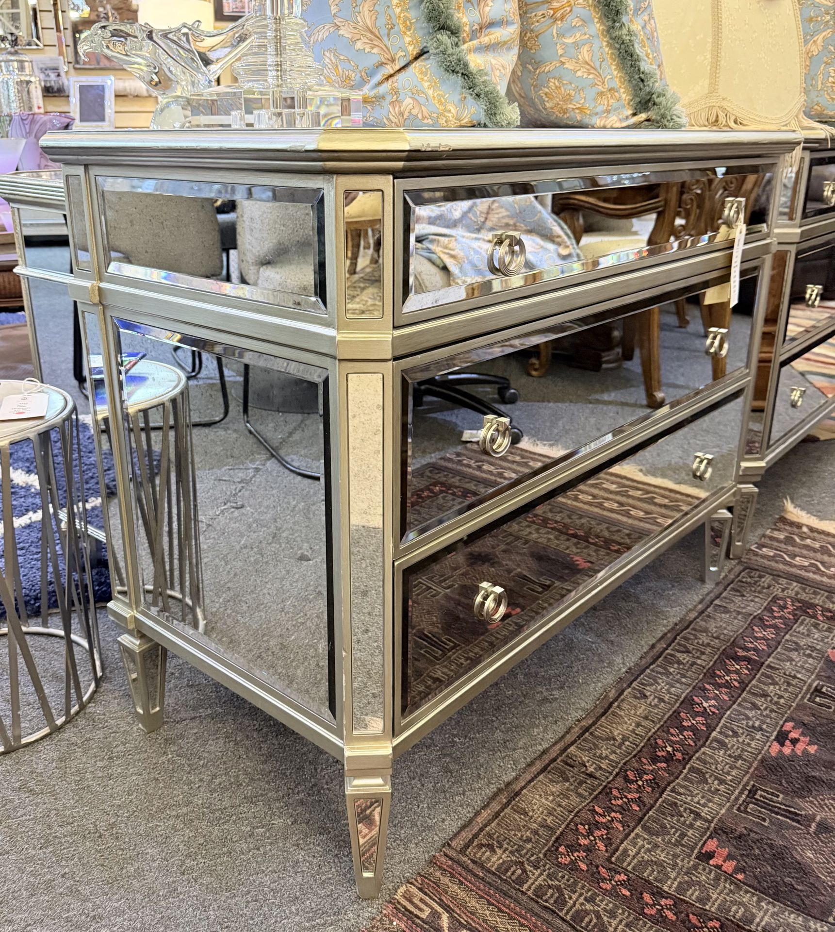 WE HAVE A LARGE INVENTORY IN HIGHEND FURNITURE, WOOD FURNITURE WITH ALL DIFFERENT COLLECTIONS. DINING ROOM SETS, BEDROOM SETS, LIVING ROOM SETS AND MANY OTHER BRANDS LIKE MAITLAND SMITH, VERSACE, BERNHARDT, HENREDON, BENNETTI AND ALSO ITEMS TO COMPLEMENT YOUR HOME DECOR, ACCESSORIES, PERFUM, JEWELRY, CHANDELIERS AND MORE. Available to see in person in Fort Lauderdale!!!! WAS BEFORE: $895 NOW: $448 Three-drawer dresser with mirror, ArtDeco. It features a refined Hollywood Regency aesthetic that combines mid-century glamour with classic details. The furniture has a wooden structure finished in a soft antique silver leaf (Antique Silver Leaf) that frames all the panels. All visible surfaces (front, sides and top) are coated with beveled mirrored glass, which helps reflect light and visually enlarge the space. The drawers are equipped with circular metal handles with a decorative design to match the finish of the structure. It rises on conical square legs that maintain the elegant and light profile of the piece. Approximate Measurements: Width: 102 cm to 107 cm (40 to 42 inches). Depth: 46 cm to 48 cm (18 to 19 inches). Height: 89 cm (35 inches). In excellent condition! We also have AICO By Michael Amini Collections… AICO Furniture designed by Michael Amini has been a TOP name brand since 1988 AICO, which stands for Amini Innovation Corp, features original furniture designs and is known for high quality and intricately designed home furnishing case goods and upholstery. They offer many collections that suit various tastes and styles. Ask for our FINANCE LAYAWAY program!!! 🦊 Additional we have Available FINANCING with Klarna, PayPal, ACIMA And more!!! Available at: Snooty Fox Consignments 840 E Oakland Park Blvd Oakland Park, FL 33334 754.206.20.77