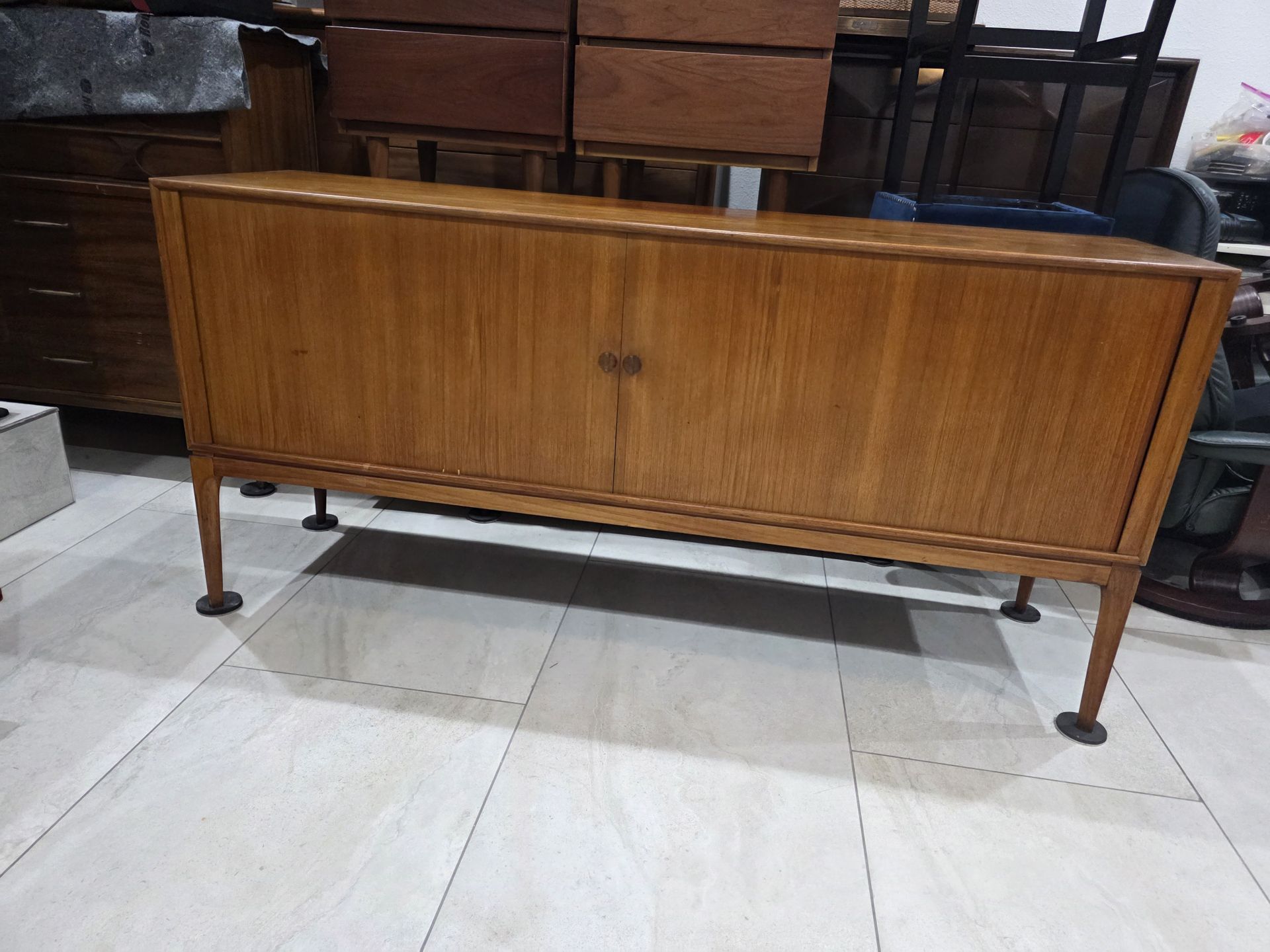 Stunning Mid Century Teakwood Sideboard-Credenza in excellent vintage condition features sleek tapered legs with tambour doors with additional storage space measures 72/19/33" tall a real eye catcher and a rare find delivery is also optional