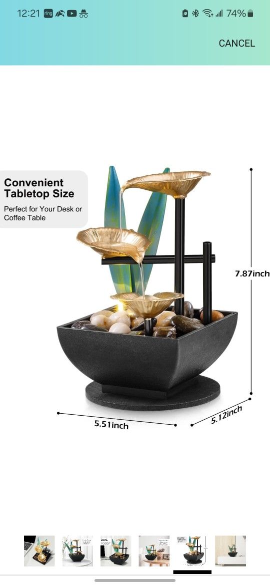 Brand new, several available. I'm in Hesperia Item description below: Indoor Tabletop Water Fountain, 3 Tier Lotus Leaf Desktop Fountain with ON/Off Switch and Natural River Rocks, Zen Relaxation for Office Living Room Bedroom Décor (B)