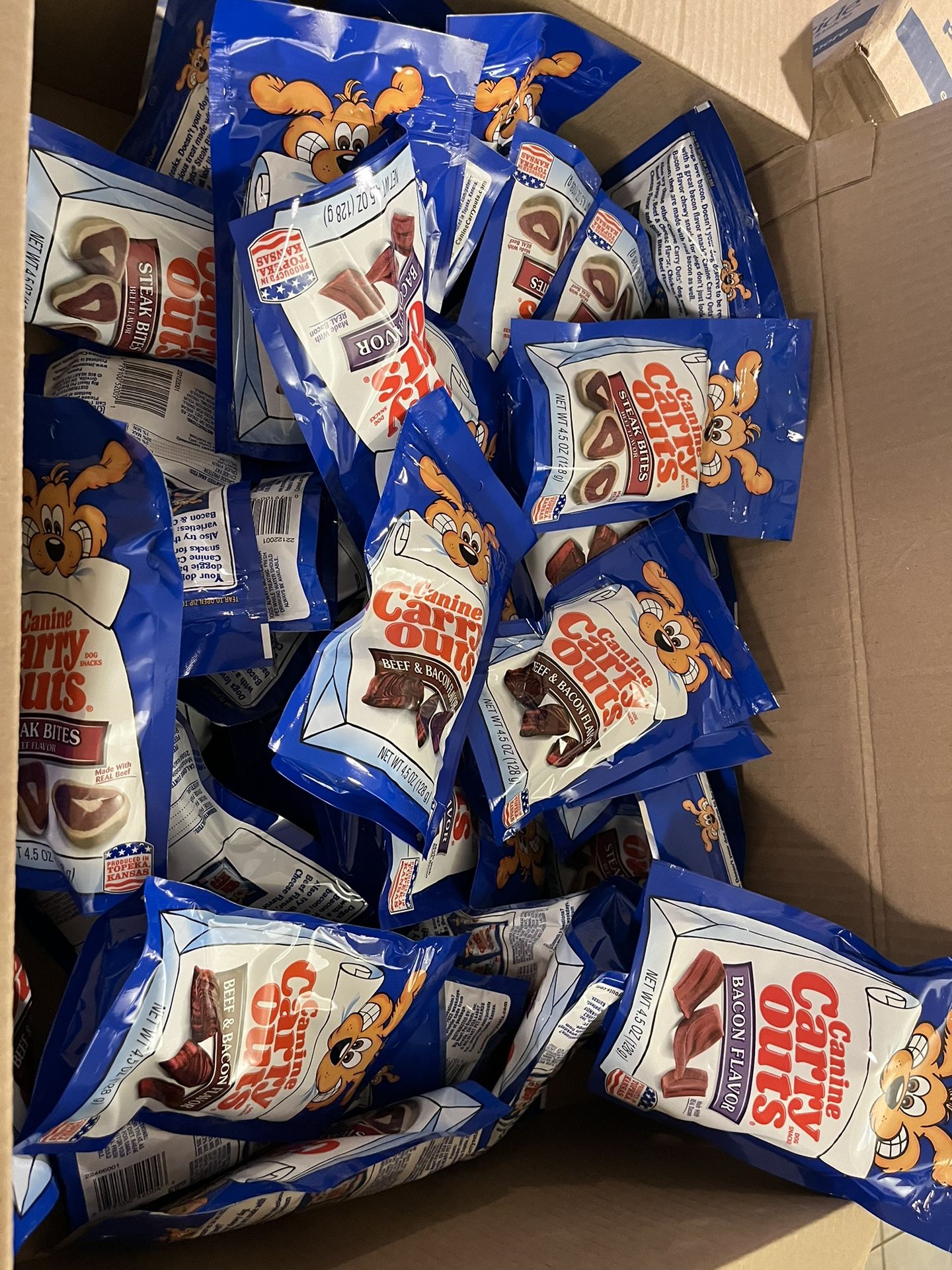 Chewy brand 4.5 oz bags of canine carry outs. Included : 12 steak bites 17 beef & bacon flavor 12 bacon flavor 6 beef flavor