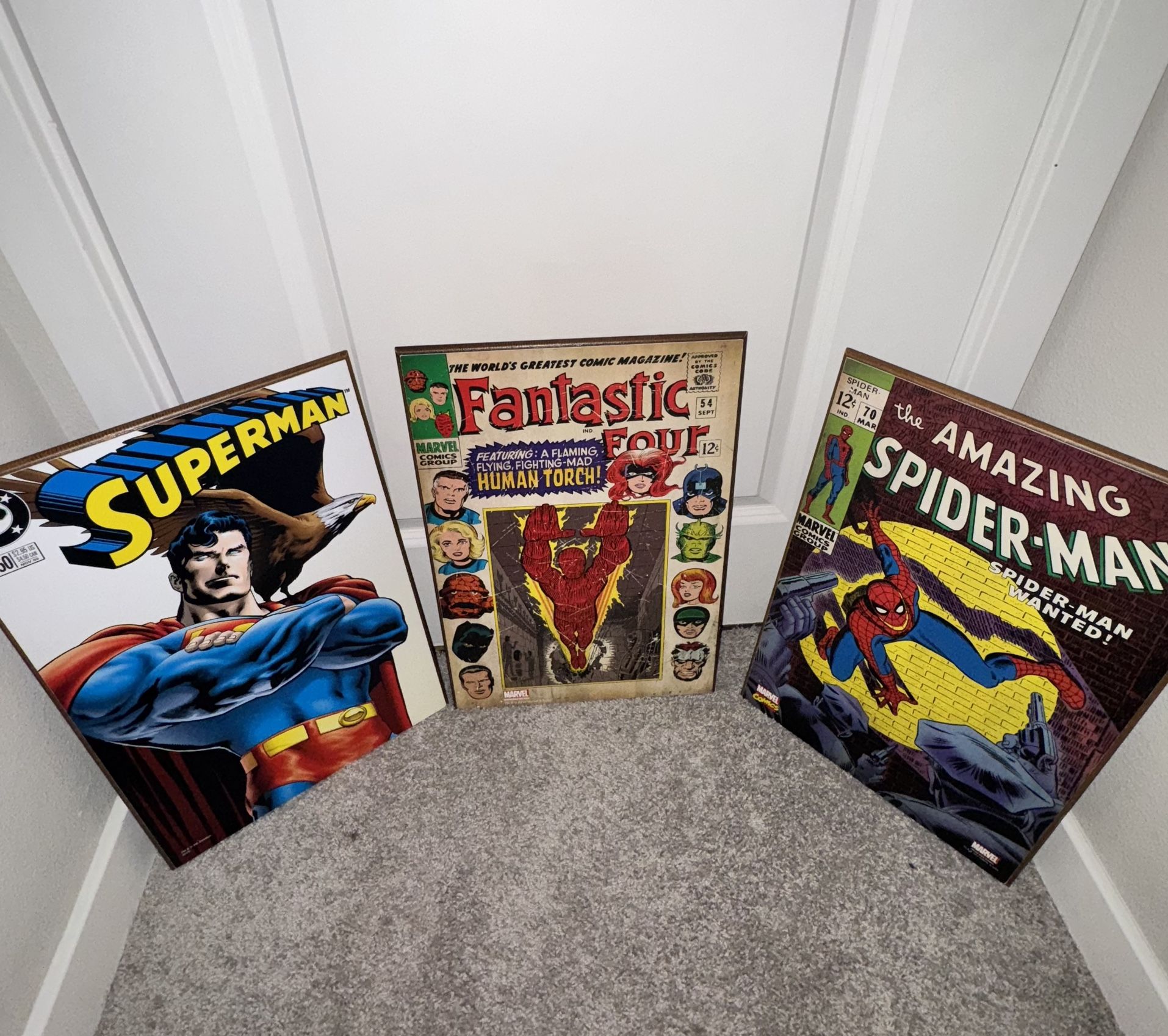 Marvel / DC Comics wall art Printed on solid wood Asking $20 for all 3 Spider-Man - Superman - Fantastic Four